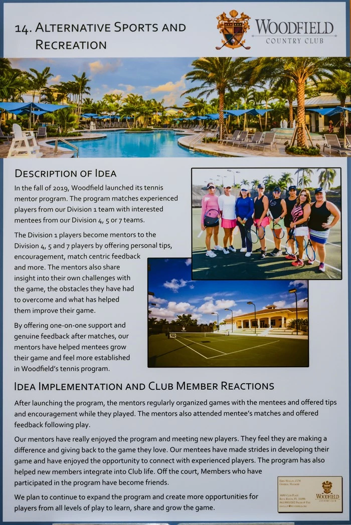 In the fall of 2019, Woodfield launched its tennis mentor program. The program matches experienced players from our Division 1 team with interested mentees from our Division 4, 5 or 7 teams.