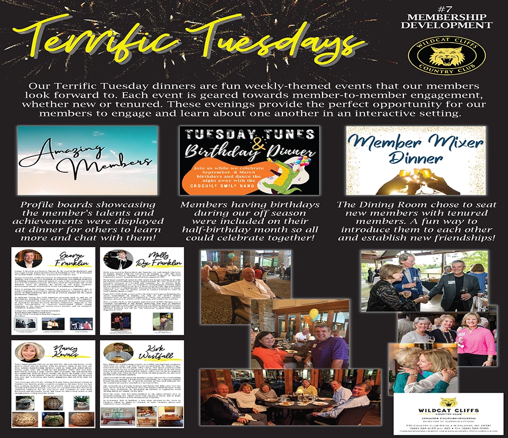 Our Terrific Tuesday dinners are fun weekly-themed events that our members look forward to. Each event is geared towards member-to-member engagement, whether new or tenured. These evenings provide the perfect opportunity for our members to engage and learn about one another in an interactive setting.