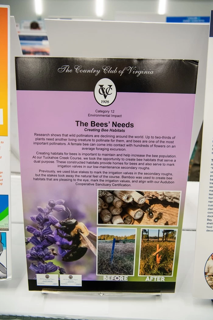 Creating habitats for bees is important to maintain and help increase the bee population. At our Tuckahoe Creek Course, we took the opportunity to create bee habitats that serve a dual purpose. These constructed habitats provide homes for bees and also serve to mark irrigation valves in our low maintenance secondary roughs. Previously, we used blue stakes to mark the irrigation valves in the secondary roughs, but the stakes took away the natural feel of the course. Bamboo was used to create bee habitats that are pleasing to the eye, mark the irrigation values, and align with our Audubon Cooperative Sanctuary Certification. The ability to find irrigation valves in a timely manner, to turn off the water running thru the pipe when there is an irrigation issue, is vital. The previous stakes accomplished this but not much else. These new bamboo stakes provide a bee habitat every day of the year.