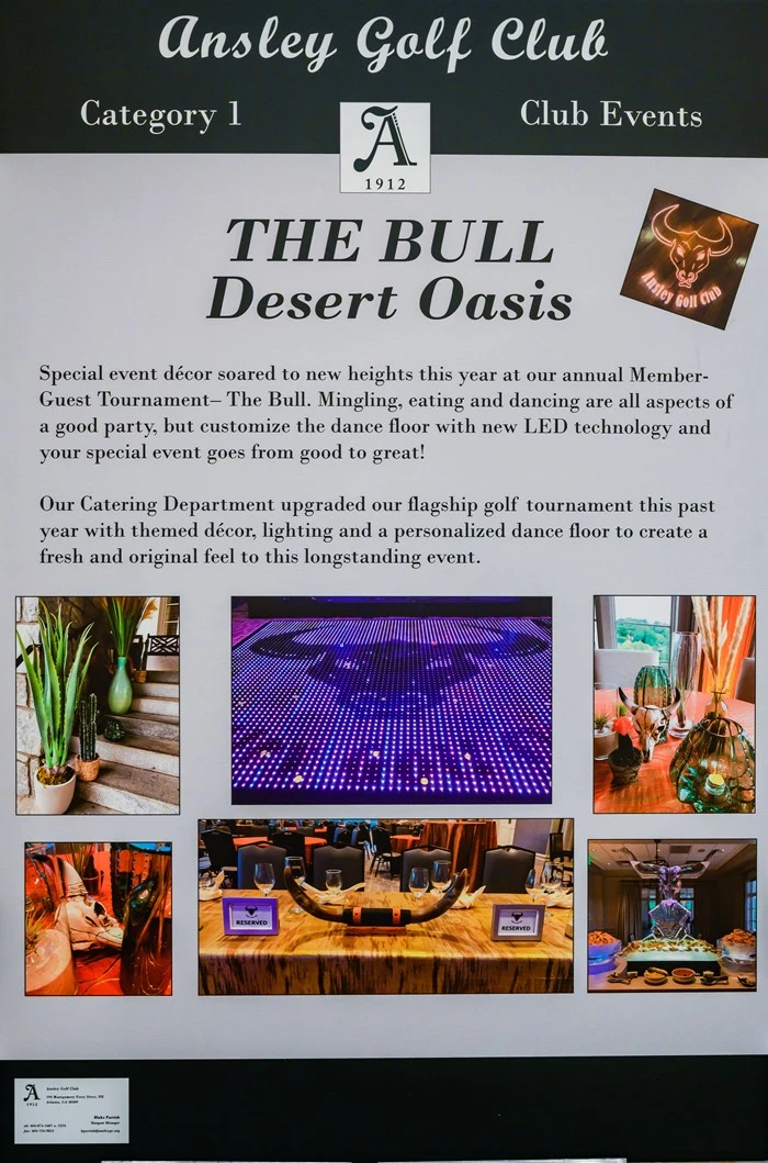 Our Member/Guest Tournament, aka The Bull, has a distinct bull logo. We decided to use that as our inspiration for Southwestern Desert themed décor. Linens in golds and oranges mixed with macramé touches and fur throws warmed up our neutral palette ballroom. Cacti and longhorn centerpieces and accents, with a tumbleweed and rope chandelier added to the clubhouse transformation.