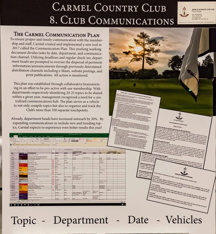 The Communication Plan was developed by Carmel’s department heads to ensure communication topics from every club segment were shared with the membership and staff at ideal times throughout the year. The plan showcases all utilized mediums including electronic and print publications. Department heads are accountable for remaining on task and completing deadlines. The plan utilizes a working excel document that allows for edits and/or additions to be made as needed.