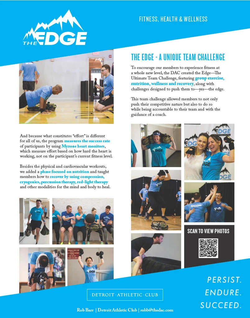 To encourage our members to experience fitness at a whole new level, the DAC created the Edge—The Ultimate Team Challenge, featuring group exercise, nutrition, wellness and recovery, along with challenges designed to push them to—yes—the edge.