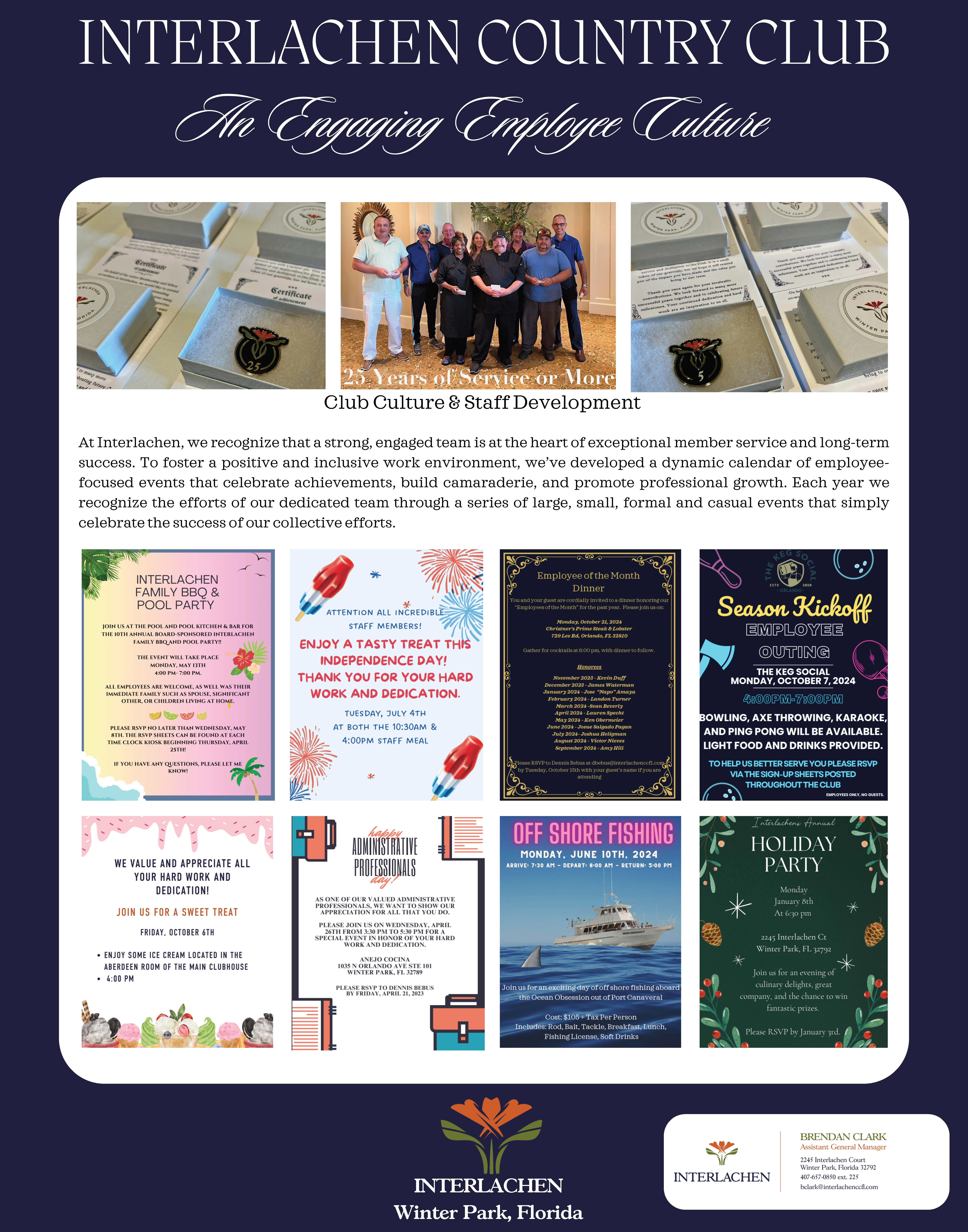 At Interlachen, we recognize that a strong, engaged team is at the heart of exceptional member service and long-term success. To foster a positive and inclusive work environment, we’ve developed a dynamic calendar of employee-focused events that celebrate achievements, build camaraderie, and promote professional growth. Each year we recognize the efforts of our dedicated team through a series of large, small, formal and casual events that simply celebrate the success of our collective efforts.