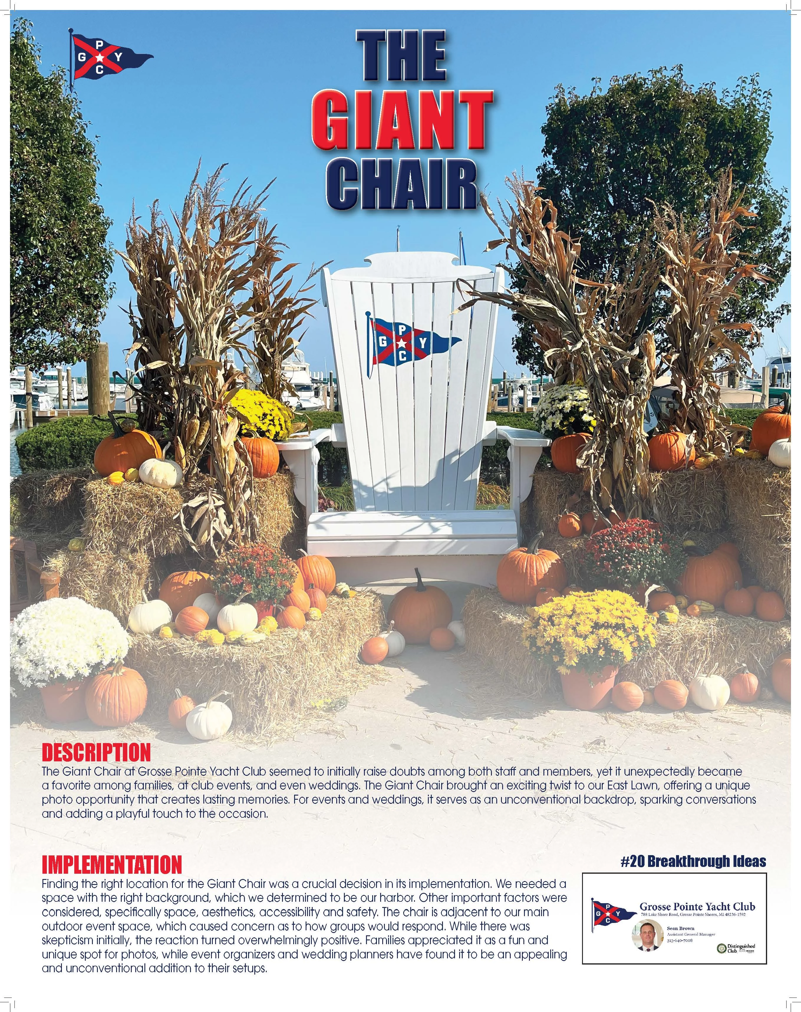 The Giant Chair at Grosse Pointe Yacht Club seemed to initially raise doubts among both staff and members, yet it unexpectedly became a favorite among families, at club events, and even weddings. The Giant Chair brought an exciting twist to our East Lawn, offering a unique photo opportunity that creates lasting memories. For events and weddings, it serves as an unconventional backdrop, sparking conversations and adding a playful touch to the occasion.