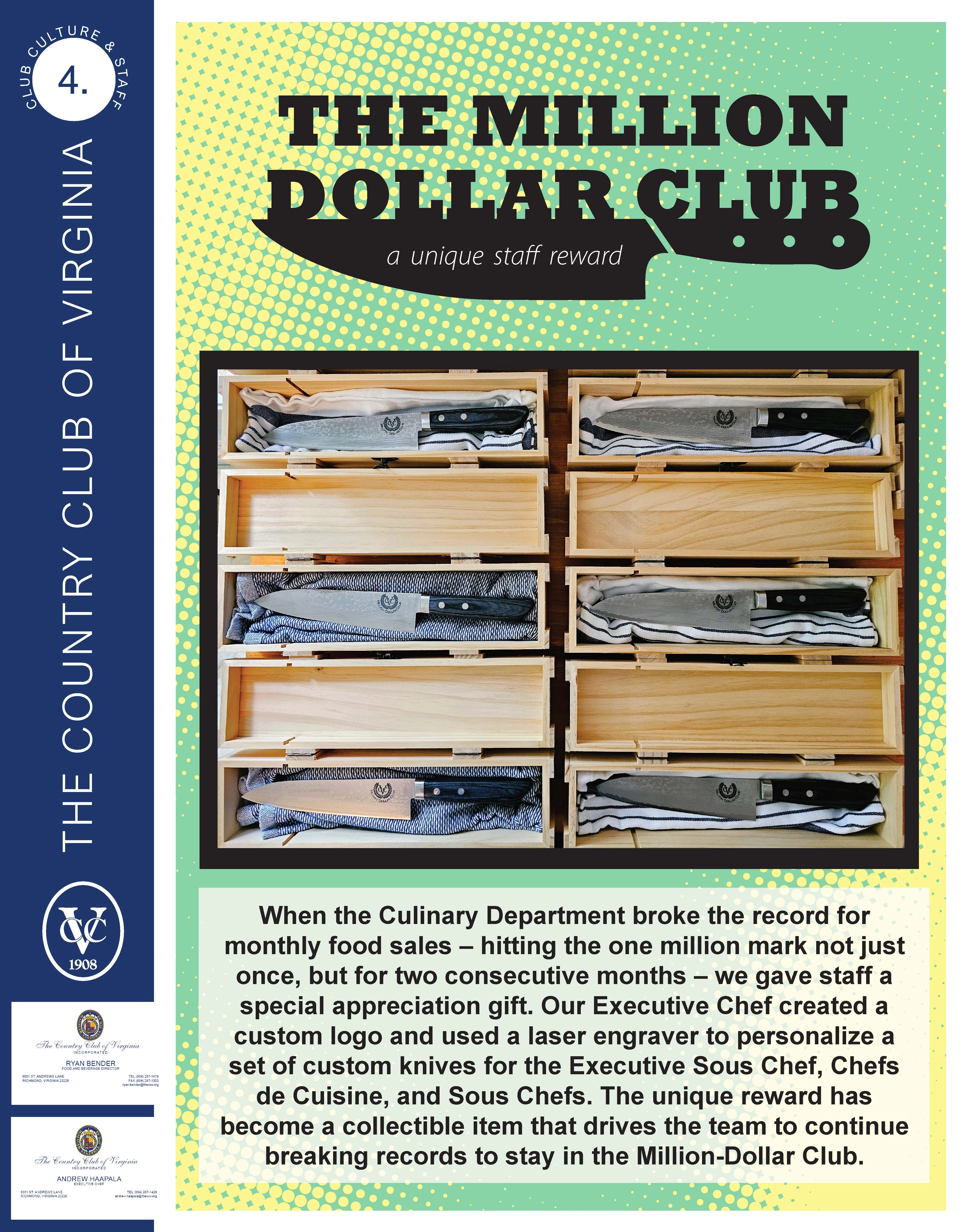 When the Culinary Department broke the record for monthly food sales – hitting the one million mark not just one, but for two consecutive months – we gave staff a special appreciation gift. Our Executive Chef created a custom logo and used a laser engraver to personalize a set of custom knives for the Executive Sous Chefs, Chef de Cuisines, and Sous Chefs. The unique reward has become a collectible item that drives the team to continue breaking records to stay in the Million-Dollar Club.