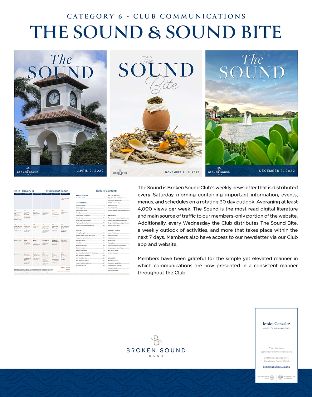 The Sound is Broken Sound Club’s weekly newsletter that is distributed every Saturday morning containing important information, events, menus, and schedules on a rotating 30-day outlook. Averaging at least 4,000 views per week, The Sound is the most-read digital literature and primary source of traffic to our members-only portion of the website. Additionally, every Wednesday the Club distributes The Sound Bite, a weekly outlook of activities, and more that takes place within the next 7 days. Members also have access to our newsletter via our Club app and website.