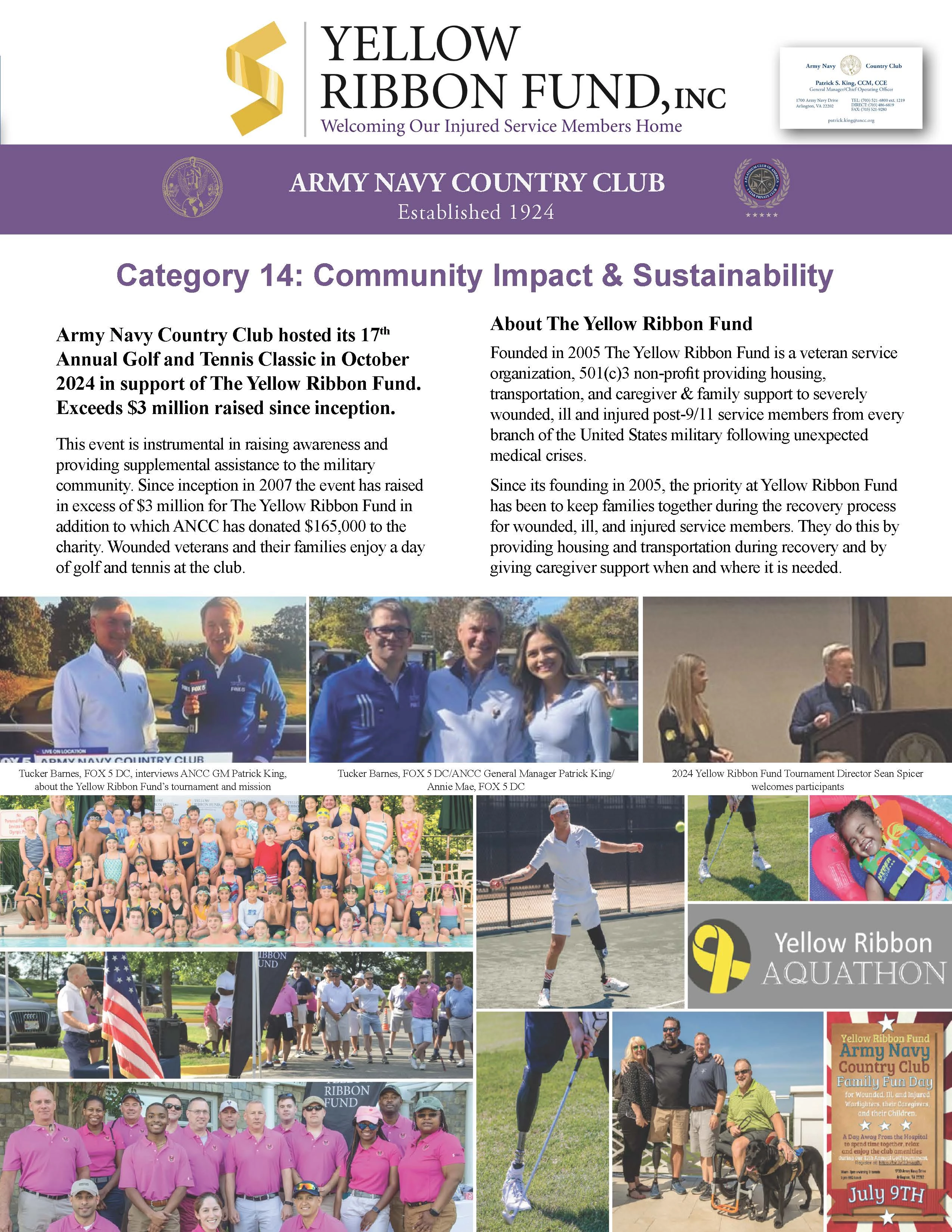 Army Navy Country Club’s members are incredibly proud of the club’s affiliation with The Yellow Fund which has continued for 17 years and raised over $3 million for the charity which provides supplemental assistance to the military community. This ties in beautifully with the club’s heritage and membership. The event has raised the club’s profile in the local community and had significant impact among military veterans.