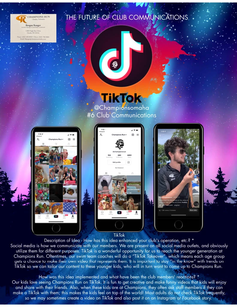 Social media is how we communicate with our members. We are present on all social media outlets, and obviously utilize them for different purposes. TikTok is a wonderful opportunity for us to reach the younger generation at Champions Run. Oftentimes, our swim team coaches will do a “TikTok Takeover”, which means each age group gets a chance to make their own video that represents them. It is important to stay “in the know” with trends on TikTok so we can tailor our content to these younger kids, who will in turn want to come up to Champions Run.