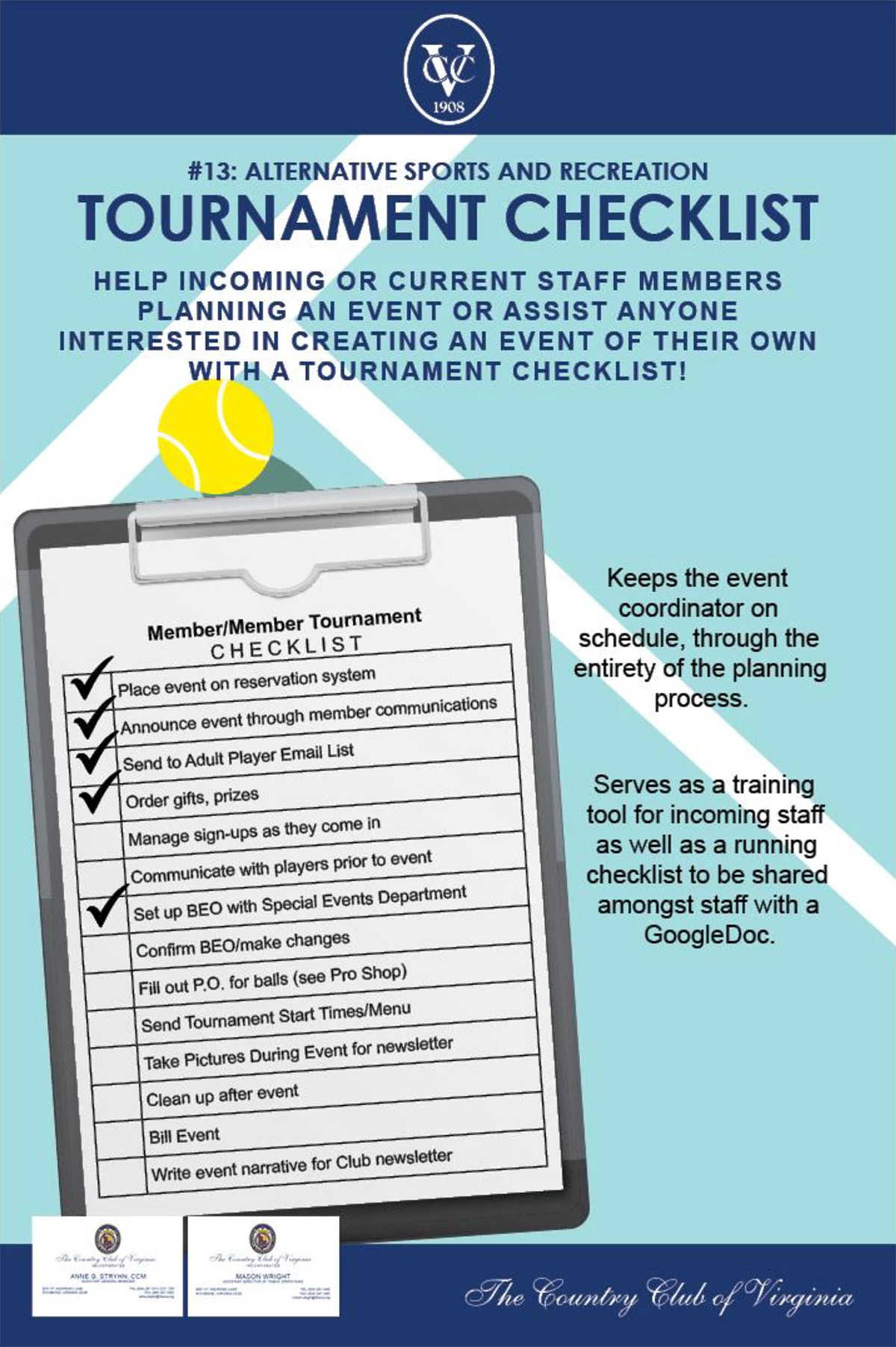 To assist new or current staff members with planning an event, we created a tournament checklist. It can even be used to assist anyone interested in creating an event of their own.