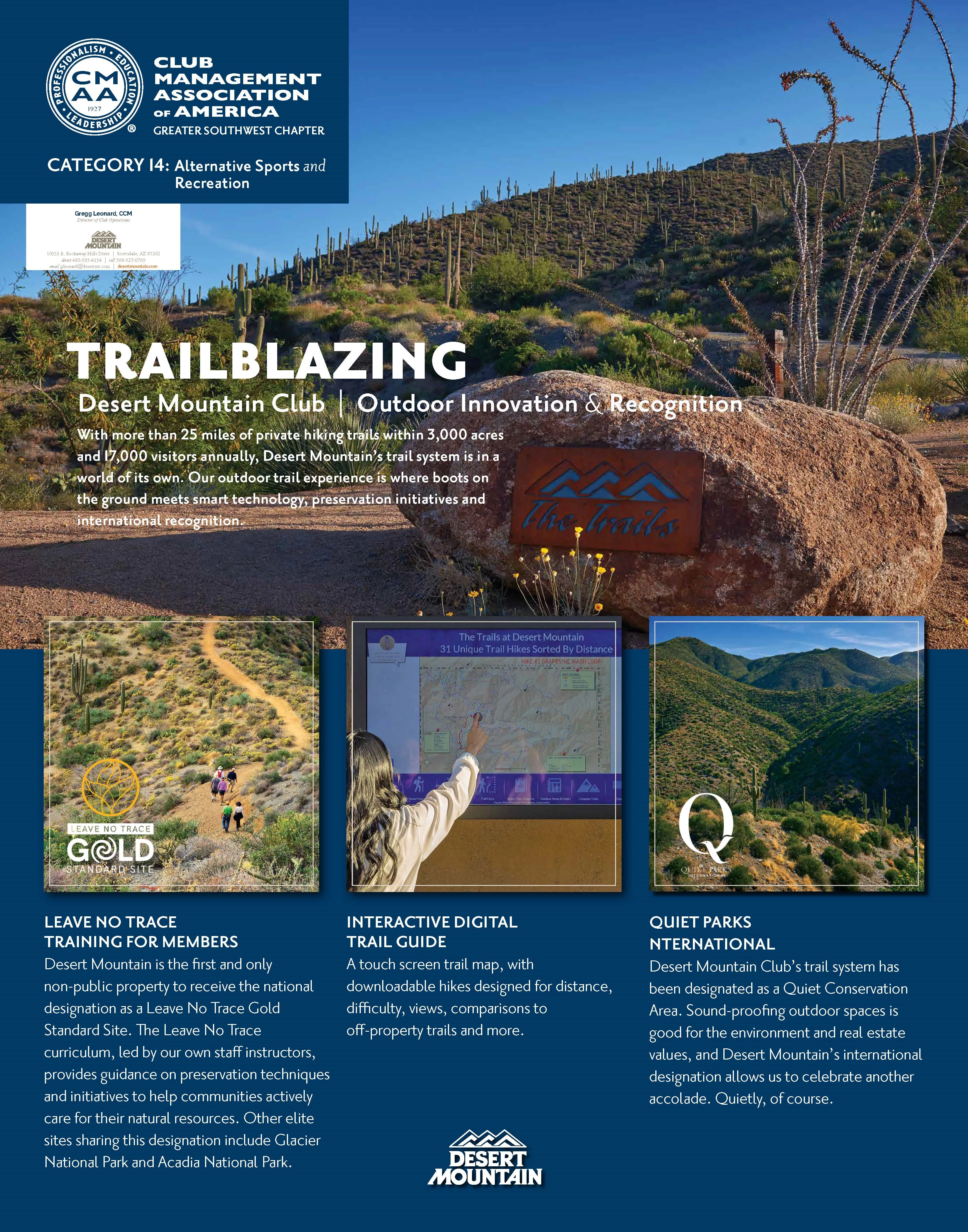 With more than 25 private miles of hiking trails within 3,000 acres and 17,000 visitors annually, Desert Mountain’s private trail system is a world of its own. Our outdoor trail experience is where outdoor recreation meets smart technology. It’s where preservation initiatives and international recognition come as a result of dedication, care, and teamwork. It’s where moonlight hikes are led by skilled leaders, and trails are built and maintained by a passionate brigade of member volunteers. Ultimately, it’s where nature is both enjoyed and protected seamlessly. Balancing active usage with preservation takes an integrated effort with boots on the ground at every level, including members, teammates, and community partners. Our idea is evolving the open space within our property into outdoor recreation opportunity that is both smart, sustainable and award-winning.