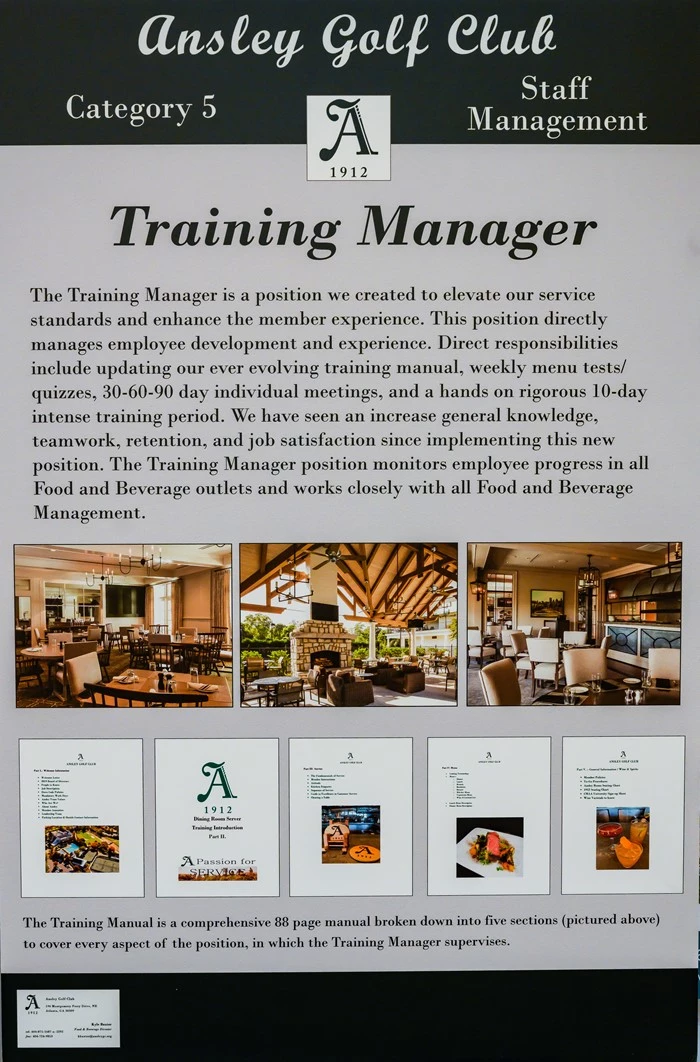 - Monthly training topics with weekly training sessions for all a la carte staff. Primary focus on product knowledge, service standards, culture and team building to enhance the overall Ansley Dining Experience