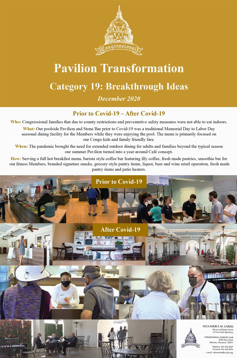 Our poolside Pavilion prior to Covid-19 was a seasonal dining facility from Memorial Day to Labor Day for families to enjoy both hot items from our menu or take away snacks. The menu is primarily focused on children and family fare. Once the pandemic brought the need for extended outdoor dining for adults and families, we turned our Pavilion into a cafe concept and expanded both our food and beverage menus. We included more complex breakfast and lunch options, and extended our beverage concept to offer an extensive coffee bar and a full bar offering alcohol. We have come to realize that this operation postpandemic may be very much desired!
