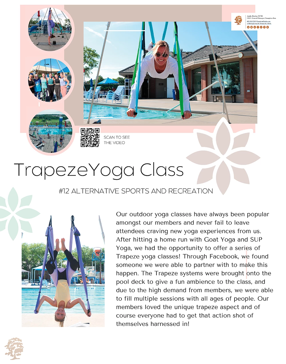 The Trapeze systems were brought onto the pool deck to give a fun ambience to the class, and due to the high demand from members, we were able to fill multiple sessions with all ages of people. Our members loved the unique trapeze aspect and of course everyone had to get that action shot of themselves harnessed in!