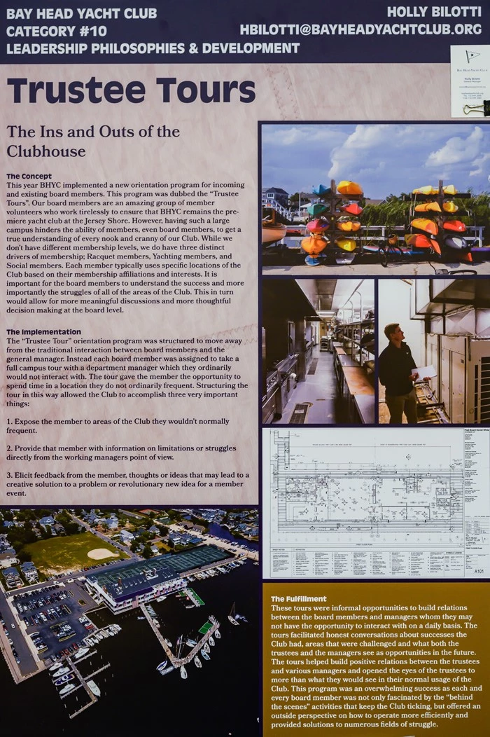 A department manager was paired up with a board member in which they would not ordinarily interact. That duo then embarked on a complete campus tour with a pre-written checklist to ensure the board member viewed every portion of the property, while specifically highlighting areas of the Club that member would not ordinarily frequent. Throughout this tour both parties engaged in casual conversation, speaking transparently about the areas of success and struggle through the department manager's eyes. Casual conversation, on many occasions, turned into thoughtful and insightful communication that revealed a fresh new look at the areas of struggle. This allowed for creative and innovative solutions and enabled the board member to get a complete understanding of the Club functions as a whole behind the scenes. The reaction from the board members was overwhelmingly positive as many members gleamed overseeing portions of the Club like the kitchen and the maintenance workshops.