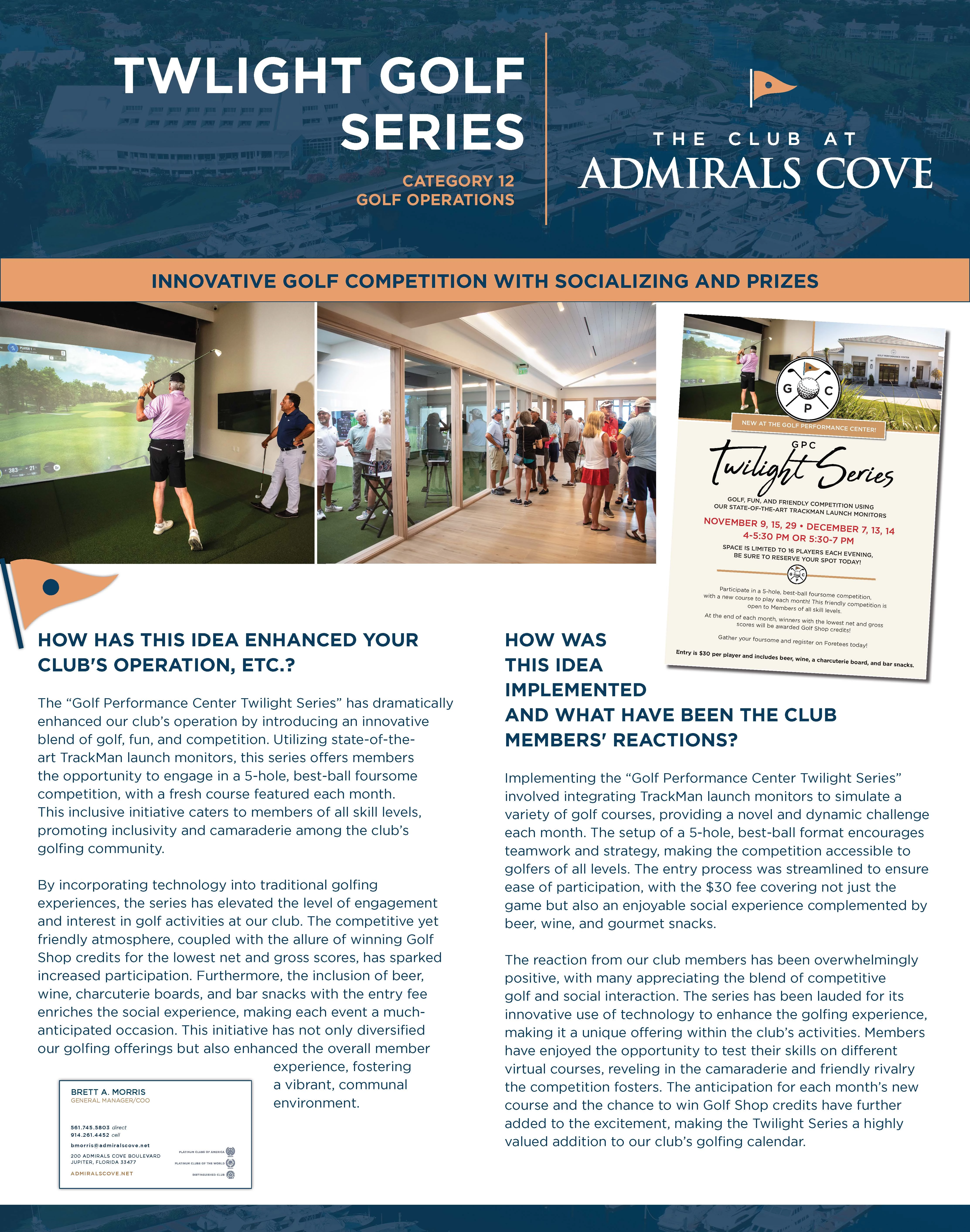 By incorporating technology into traditional golfing experiences, the series has elevated the level of engagement and interest in golf activities at our club. The competitive yet friendly atmosphere, coupled with the allure of winning Golf Shop credits for the lowest net and gross scores, has sparked increased participation. Furthermore, the inclusion of beer, wine, charcuterie boards, and bar snacks with the entry fee enriches the social experience, making each event a much-anticipated occasion. This initiative has not only diversified our golfing offerings but also enhanced the overall member experience, fostering a vibrant, communal environment.