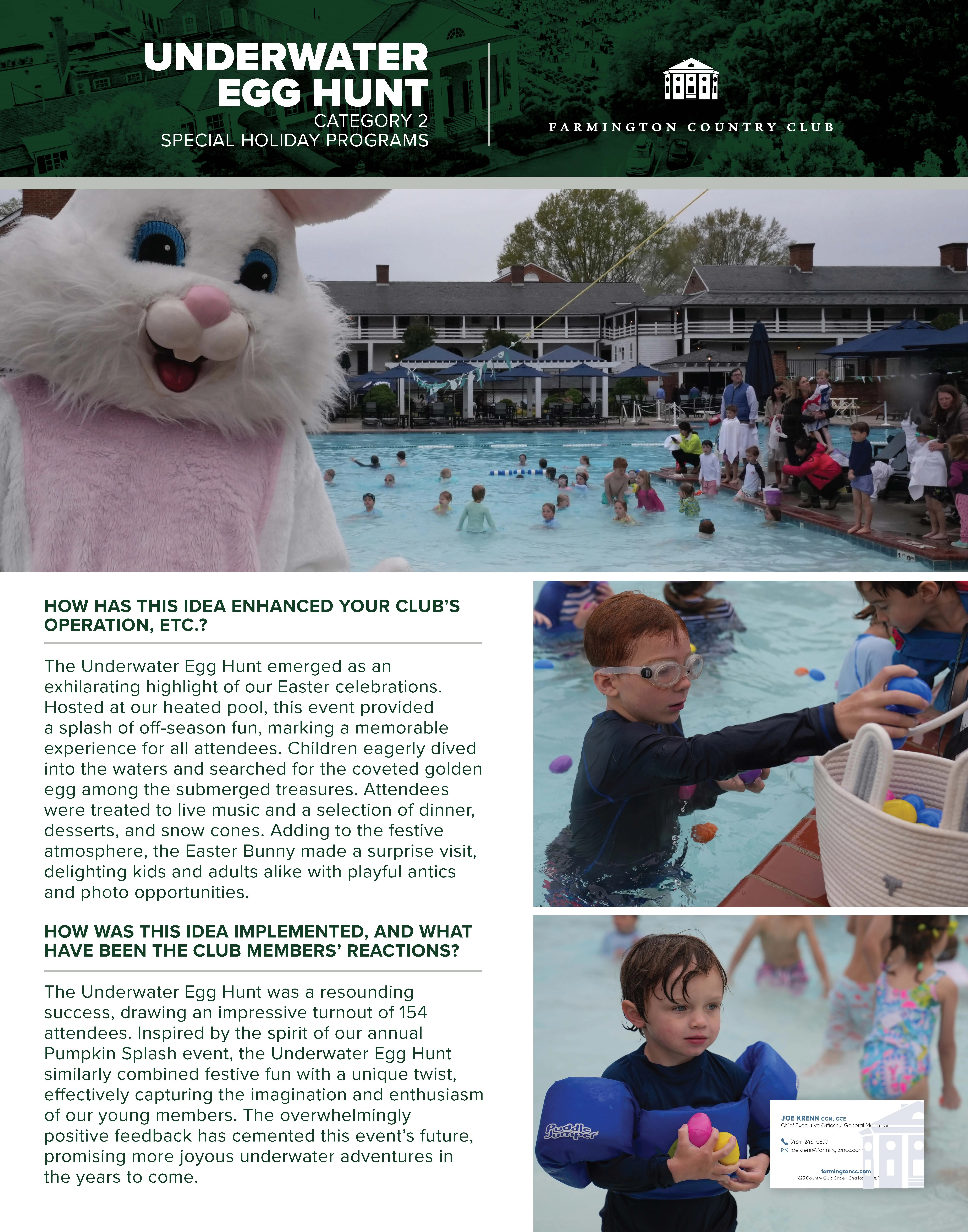 The Underwater Egg Hunt was a resounding success, drawing an impressive turnout of 154 attendees. Inspired by the spirit of our annual Pumpkin Splash event, the Underwater Egg Hunt similarly combined festive fun with a unique twist, effectively capturing the imagination and enthusiasm of our young members. The overwhelmingly positive feedback has cemented this event’s future, promising more joyous underwater adventures in the years to come.