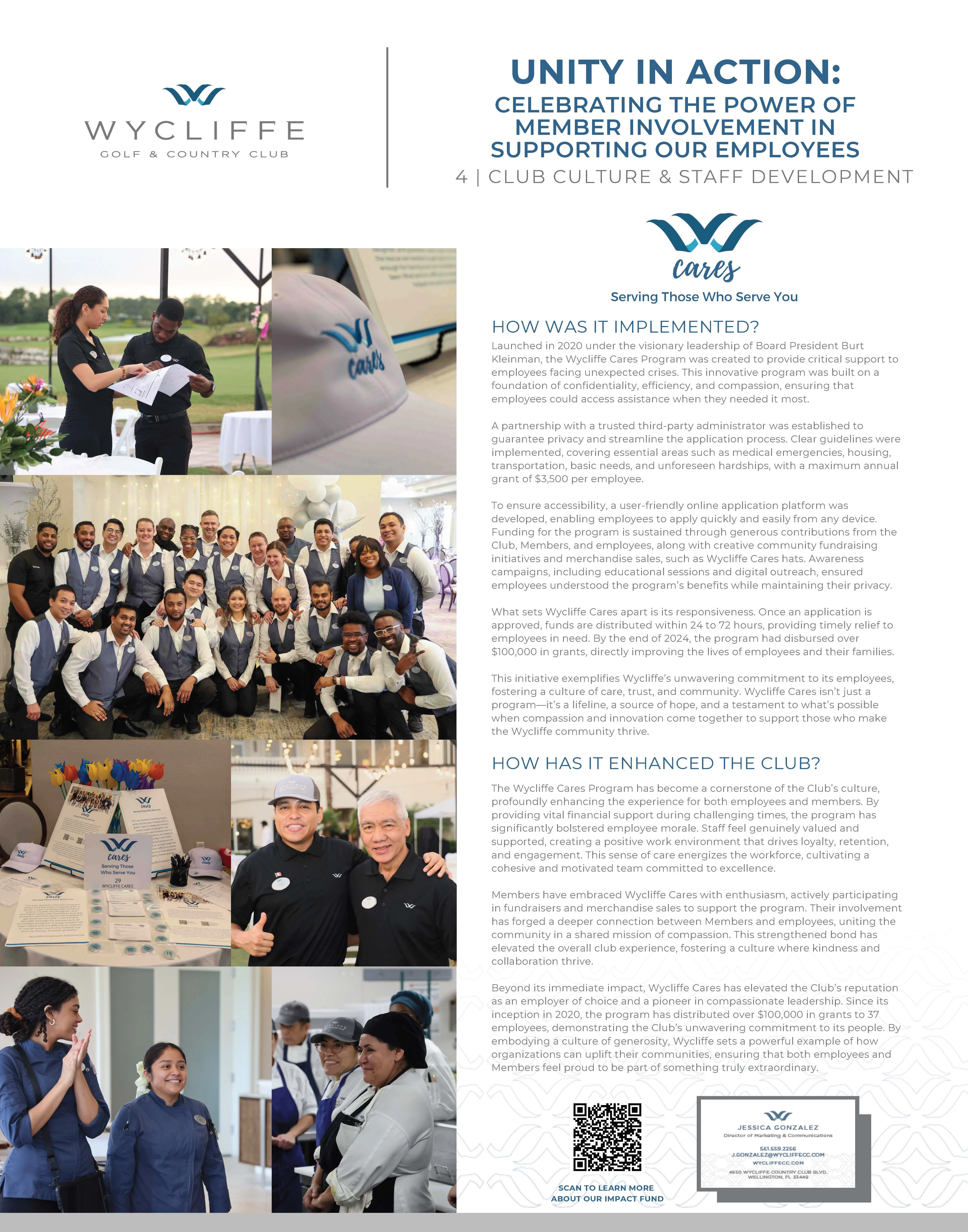 The Wycliffe Cares Program has become a cornerstone of the Club’s culture, profoundly enhancing the experience for both employees and members. By providing vital financial support during challenging times, the program has significantly bolstered employee morale. Staff feel genuinely valued and supported, creating a positive work environment that drives loyalty, retention, and engagement. This sense of care energizes the workforce, cultivating a cohesive and motivated team committed to excellence.