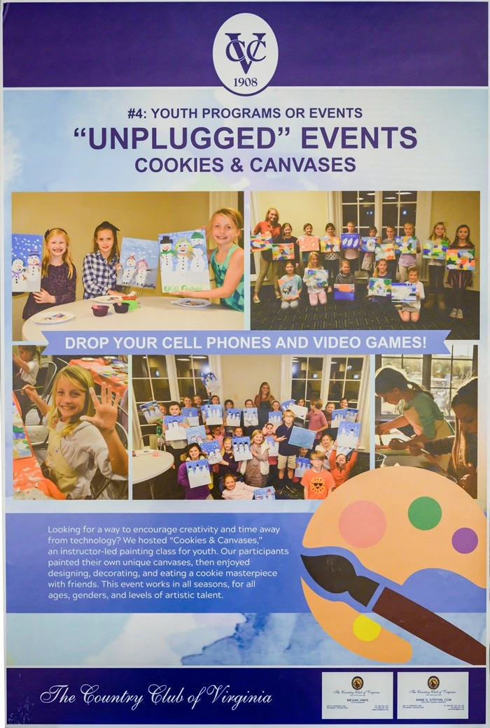 Putting paint brushes in their hands and keeping cell phones away was our goal at this event. The kids had a template to follow along with the help of an art instructor leading the class, but the class allowed the kids to put their creative skills to work on a canvas before they enjoyed decorating and eating a cookie masterpiece with friends. The parents were highly impressed with the outcome of the canvas masterpieces and were thrilled that kids were not physically able to use their cell phones during the event.