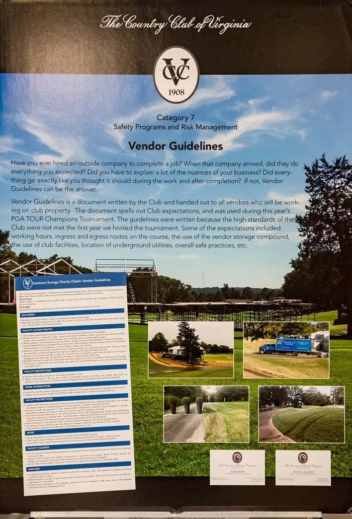 Vendor Guidelines is a document written by the Club and handed out to all vendors who will be working on club property. The document spells out Club expectations, and was used during this year’s PGA Tour Champions Tournament. The guidelines were written because the high standards of the Club were not met the first year we hosted the tournament.