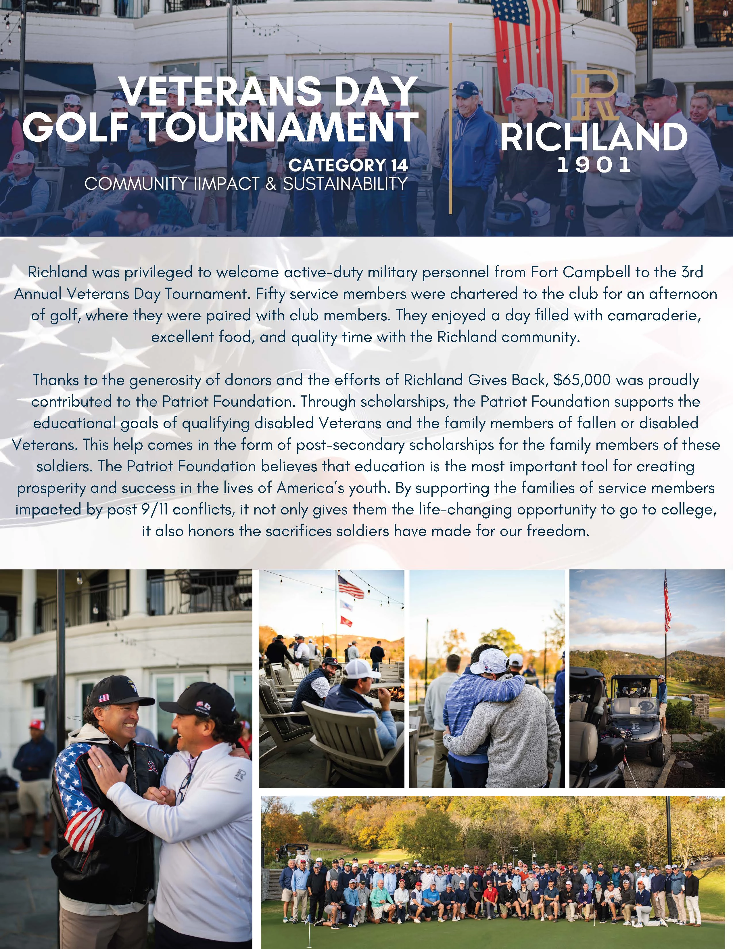 Richland's 3rd Annual Veterans Day Tournament was significantly enriched by the participation of 50 active-duty service members from Fort Campbell. The tournament provided these military personnel with an opportunity to enjoy an afternoon of golf alongside Richland club members, fostering camaraderie, mutual respect, and a sense of community. The event featured not only excellent food but also meaningful interaction between service members and club participants, strengthening the bond between the club and the broader community. As part of the larger "Richland Gives Back" initiatives, this tournament highlights the club's commitment to giving back, creating goodwill, and establishing a shared purpose among members and the surrounding community.