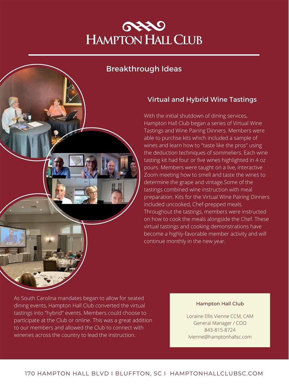 As South Carolina mandates began to allow for seated dining events, Hampton Hall Club converted the virtual tastings into "hybrid" events. Members could choose to participate at the Club or online. This was a great addition to our members and allowed the Club to connect with wineries across the country to lead the instruction.