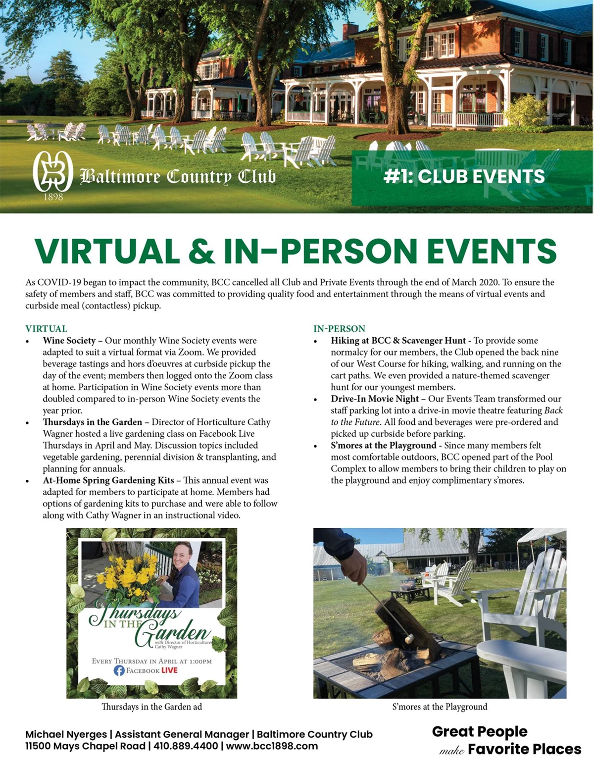 As COVID-19 began to impact the community, BCC cancelled all Club and Private Events through the end of March 2020. To ensure the safety of members and staff, BCC was committed to our Simple Truth of Great People Make Favorite Places and we focused on providing quality food and entertainment through the means of virtual events and curbside meal (contactless) pickup.