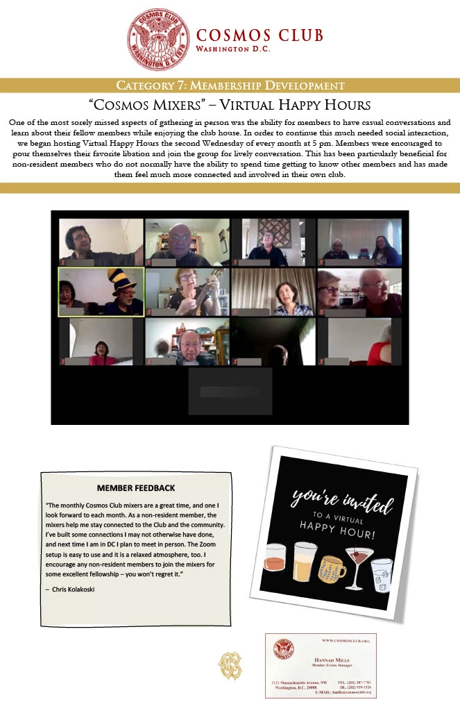 Our virtual happy hours begin with a warm welcome from the host and then move into a quick situational update and Q&A session from our Club President and General Manager. The group is then split into 3 smaller break out rooms randomly. Each break out room is assigned an 'anchor' who will serve as the conversation leader for that particular group. Each session has an open-ended prompt to encourage conversation and lead topics, such as "describe a conversation you will never forget'" or "a risk I took that paid off". These questions have led to members to find many things in common that otherwise would not have been discovered, and new friendships have formed for those who may never have crossed paths at the club. These happy hours are loved by many members and serve as a crucial way to keep the camaraderie alive while being separated physically. Club Member Chris Kolakowski said “The monthly Cosmos Club mixers are a great time, and one I look forward to each month. As a non-resident member, the mixers help me stay connected to the Club and the community. I’ve built some connections I may not otherwise have done, and next time I am in DC I plan to meet in person. The Zoom setup is easy to use and it is a relaxed atmosphere, too. I encourage any non-resident members to join the mixers for some excellent fellowship – you won’t regret it.”