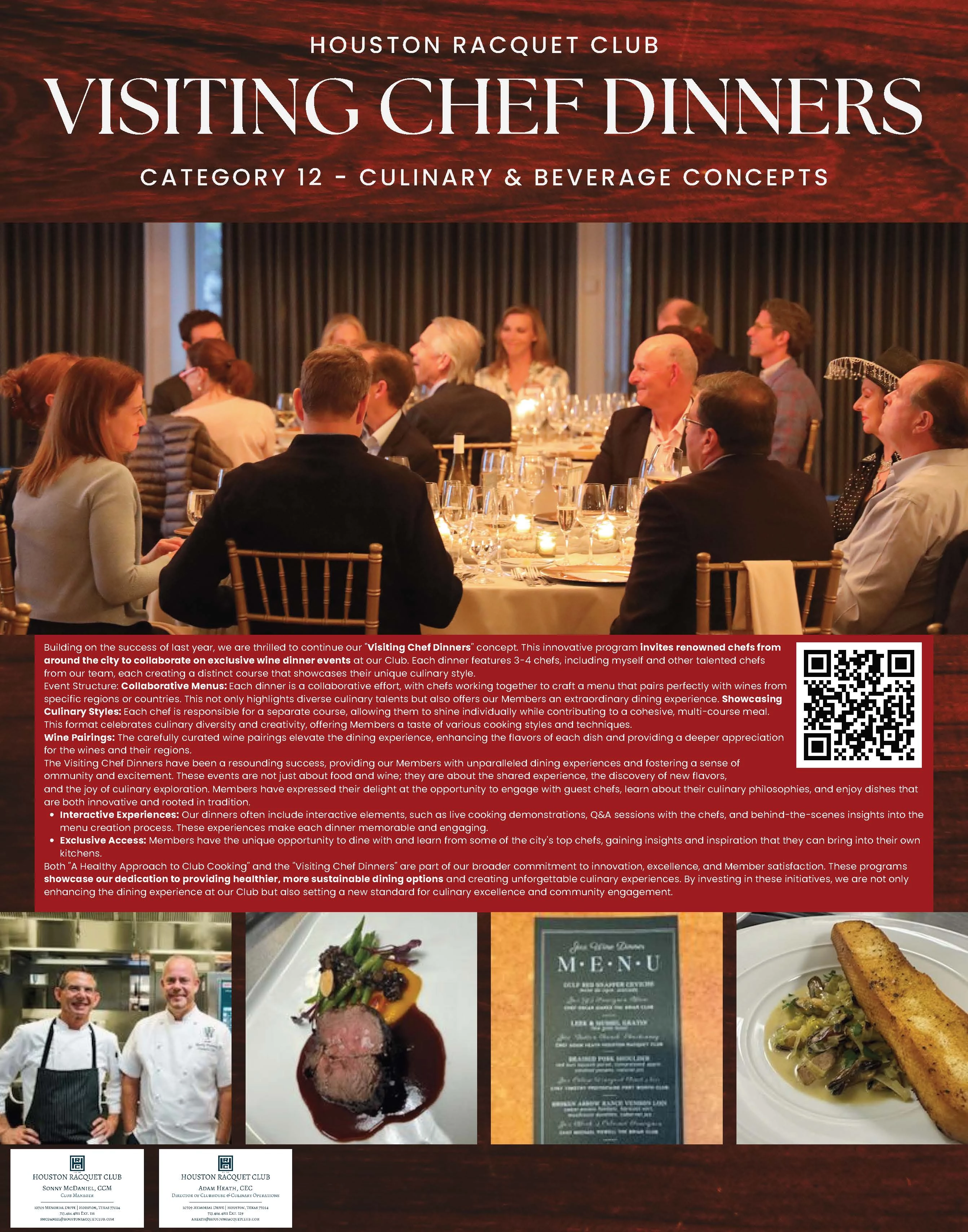 The "Visiting Chef Dinners" is part of our broader commitment to innovation, excellence, and Member satisfaction. This program showcases our dedication to providing healthier, more sustainable dining options and creating unforgettable culinary experiences. By investing in these initiatives, we are not only enhancing the dining experience at our Club but also setting a new standard for culinary excellence and community engagement.