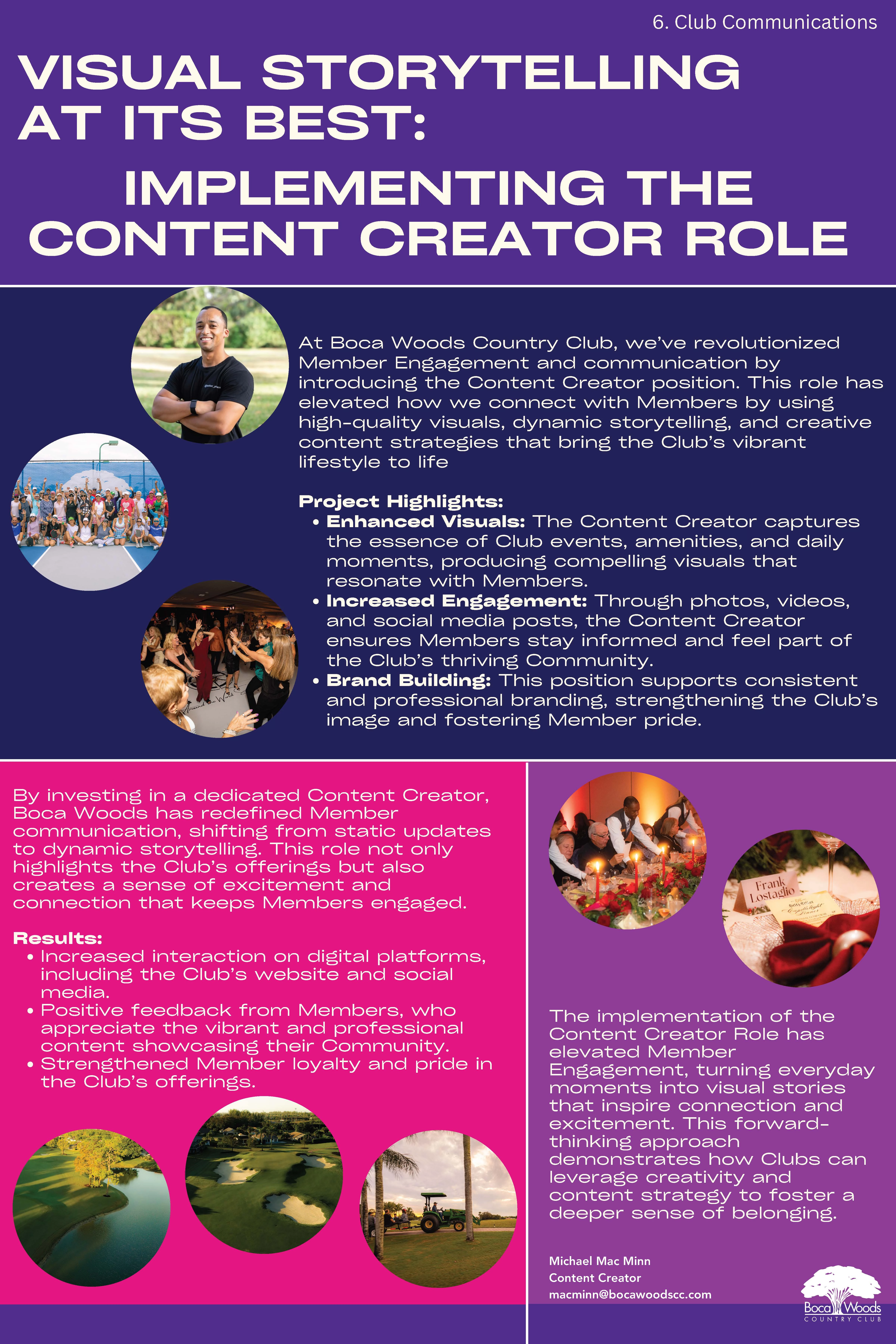 This role was introduced to elevate Member engagement and strengthen the club’s branding through high-quality visuals, dynamic storytelling, and creative content strategies. The Content Creator captures the essence of the club's activities, events, and amenities, fostering a deeper connection between Members and the club's offerings.