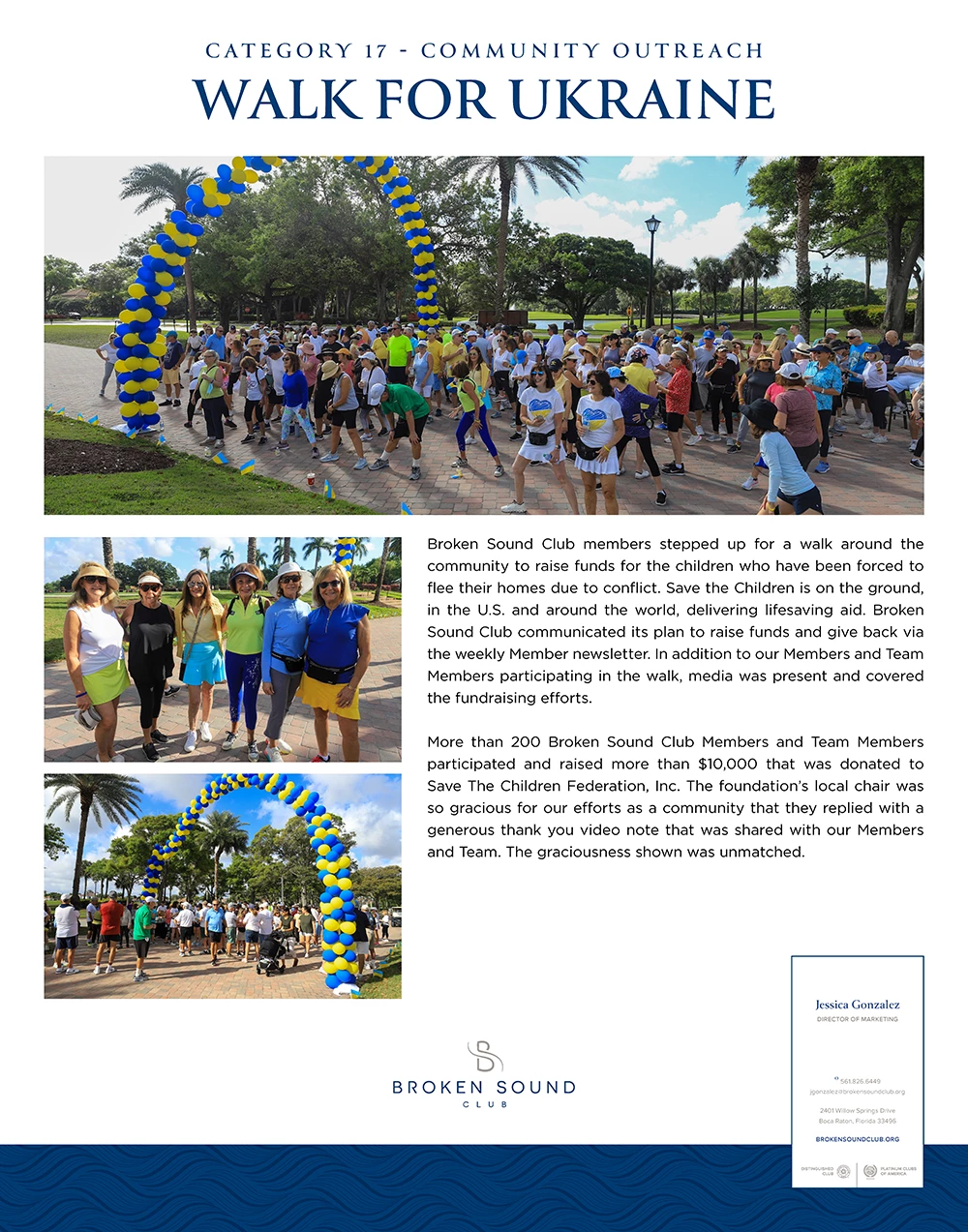 Broken Sound Club members stepped up for a walk around the community to raise funds for the children who have been forced to flee their homes due to conflict. Save the Children is on the ground, in the U.S. and around the world, delivering lifesaving aid. Broken Sound Club communicated its plan to raise funds and give back via the weekly Member newsletter. In addition to our Members and Team Members participating in the walk, media was present and covered the fundraising efforts.