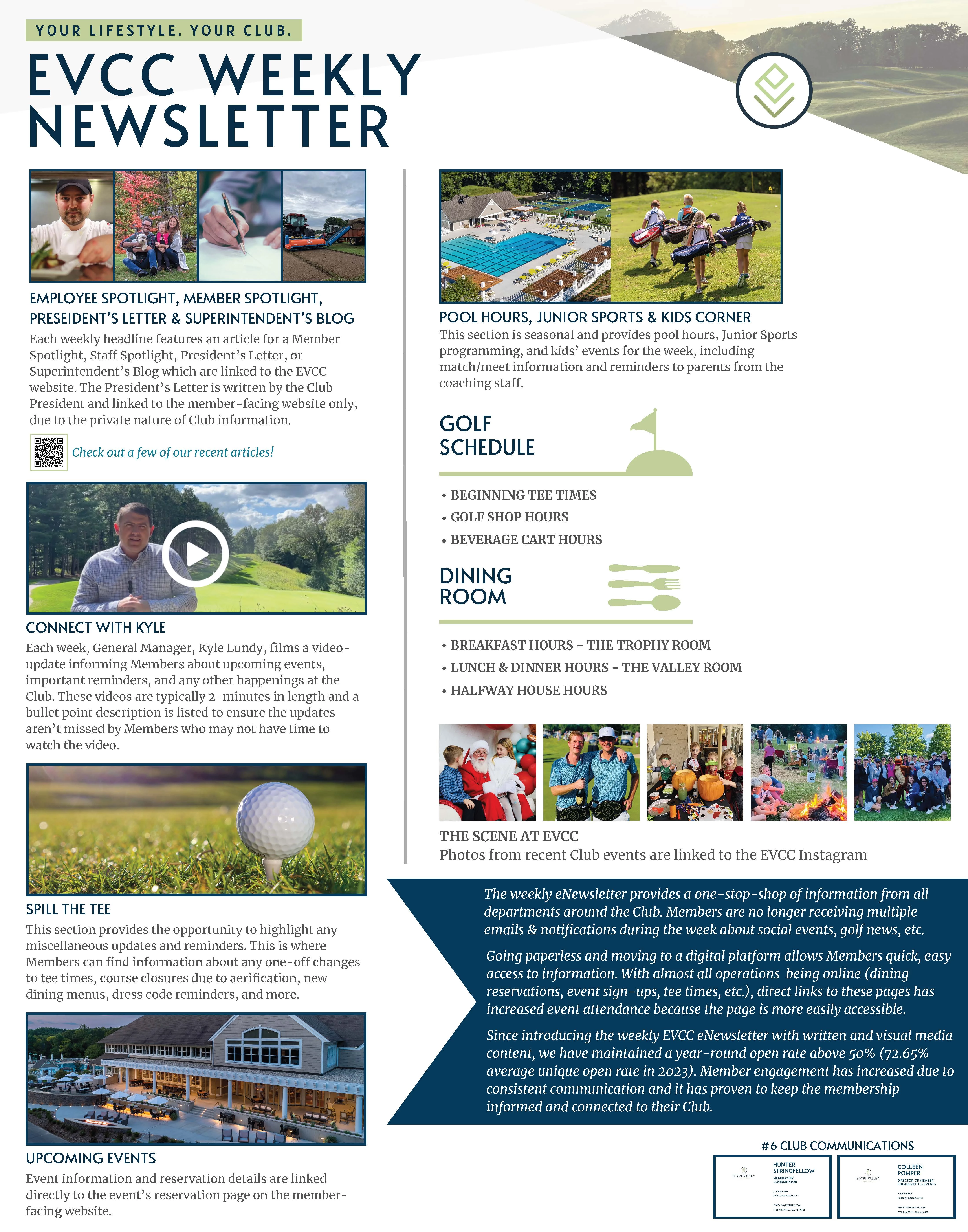The weekly eNewsletter provides a one-stop-shop of information from all departments around the Club combining informational and club lifestyle messaging. With this single communication sent every Monday, Members are no longer receiving multiple emails & notifications during the week about social events, golf news, etc. Since introducing the weekly EVCC eNewsletter with written and visual content, we have maintained a year-round open rate above 50% (72.65% average unique open rate in 2023). Member engagement has increased due to consistent communication and it has proven to keep Members informed and connected to their Club. Going paperless and moving to a digital platform allows Members quick, easy access to information. With almost all operations (dining reservations, event sign-ups, tee times, etc.) being online, direct links to these pages have become more easily accessible.