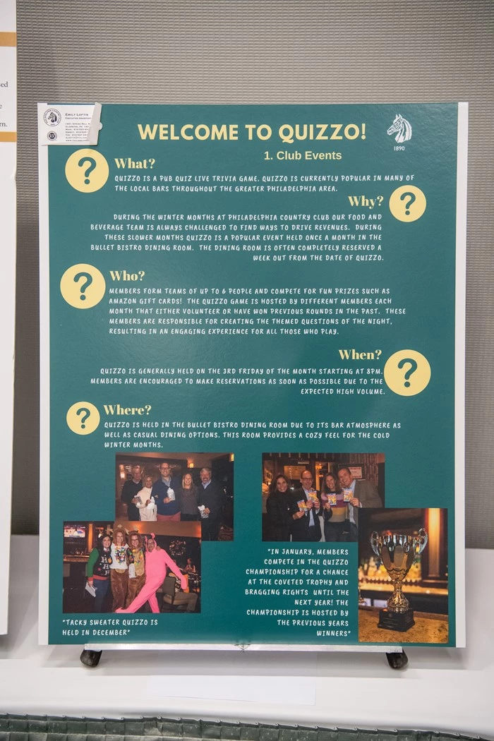 Quizzo is a live pub quiz trivia game that has become popular in local bars throughout the Greater Philadelphia Area. During the slower winter months, our Food & Beverage Team is challenged to find ways to drive revenues. The new Quizzo initiative has created buzz around the club, keeping members engaged in the dining outlets. Members form teams of up to 6 players and compete for various prizes. Members also rotate each month as host and are responsible for creating the themed questions, resulting in an engaging experience for all members. In addition, Quizzo in December is appropriately themed Tacky Sweater and in January, members compete for the coveted Quizzo Championship Trophy and bragging rights until the following year!