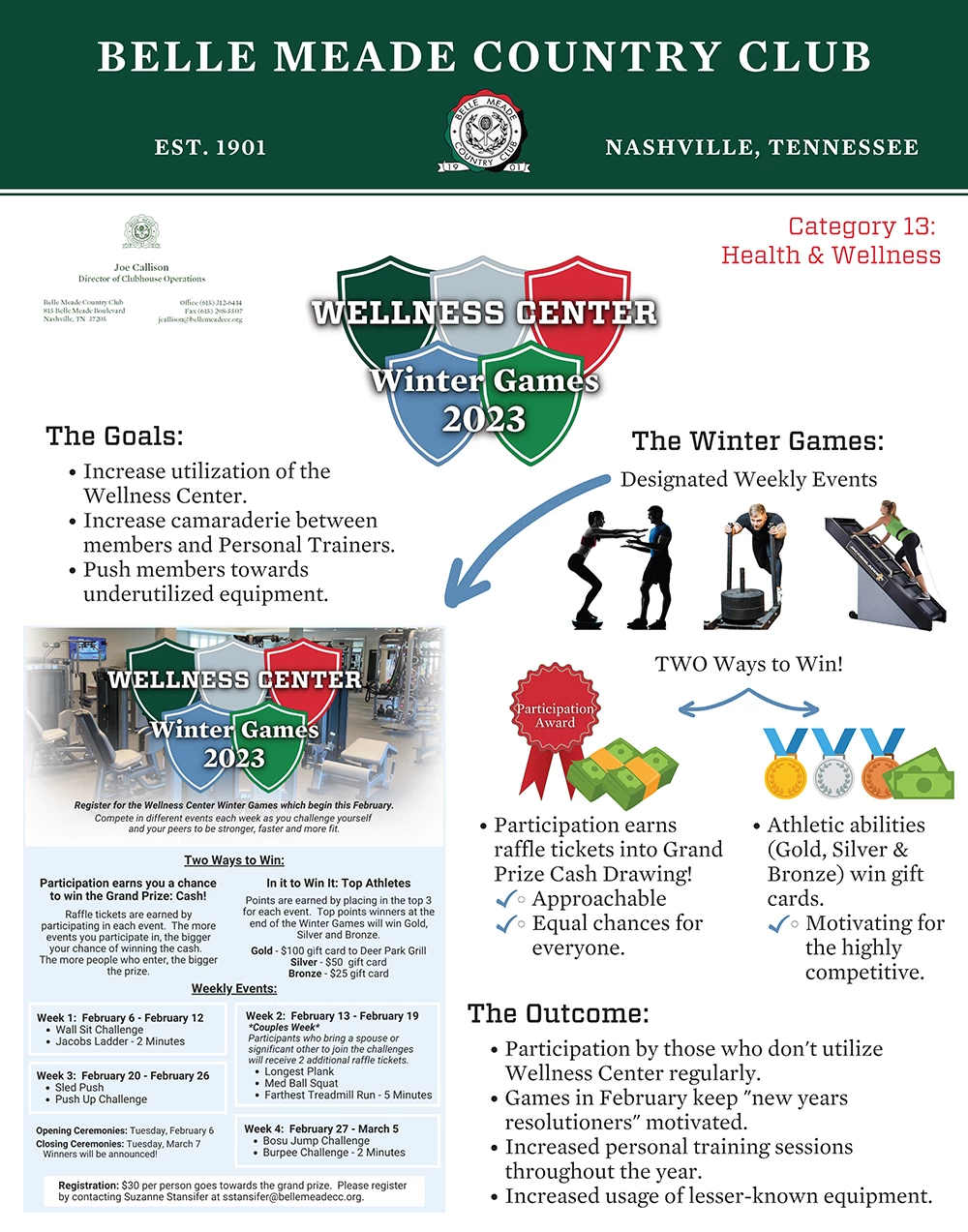 The goal behind the Winter Games was to increase weekly utilization of the Wellness Center, increase camaraderie amongst members utilizing the Wellness Center, and increase knowledge of underutilized equipment. By incentivizing members with a cash grand prize based on participation alone, we saw members who haven’t participated in Wellness Center athletic-based and nutrition-based events participate in the Winter Games. Additionally, the approachability and low intimidation of this event has encouraged new members to get excited about trying out the Wellness Center for the first time since this activity has had such a buzz around our club. Lastly, by providing participants with specific weekly “events” and challenges, we were able to guide them towards underutilized areas and equipment. Since members get one shot at “competing” and are encouraged to practice and train before their qualifying time is recorded, we have seen increased communication with staff trainers and between members. Best of all, this communication has led to increased personal training sessions and better relationships well after the Winter Games have ended.