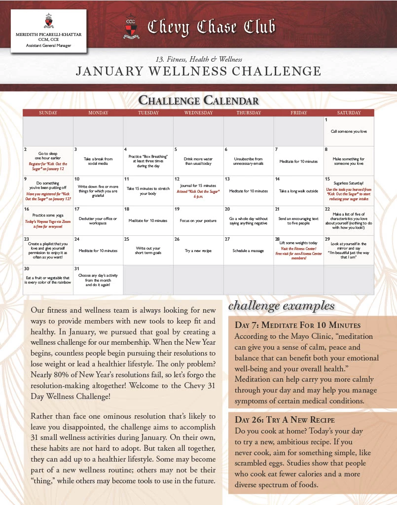 We launched the club’s 31 day of wellness towards the end of December through our bi-monthly virtual bulletin in addition to sharing it on the club’s fitness page of the website. There are links within the calendar that include instructions and educational resources about that practice or inviting them, for example, to join us to practice some yoga with a zoom link to the class. We have asked members to send us a video of them doing one of the daily wellness challenges to be entered into a raffle to win a complimentary massage. Members have commented to our Fitness and Wellness Director that they have enjoyed the daily reminders to try something different to help them on their wellness journey.