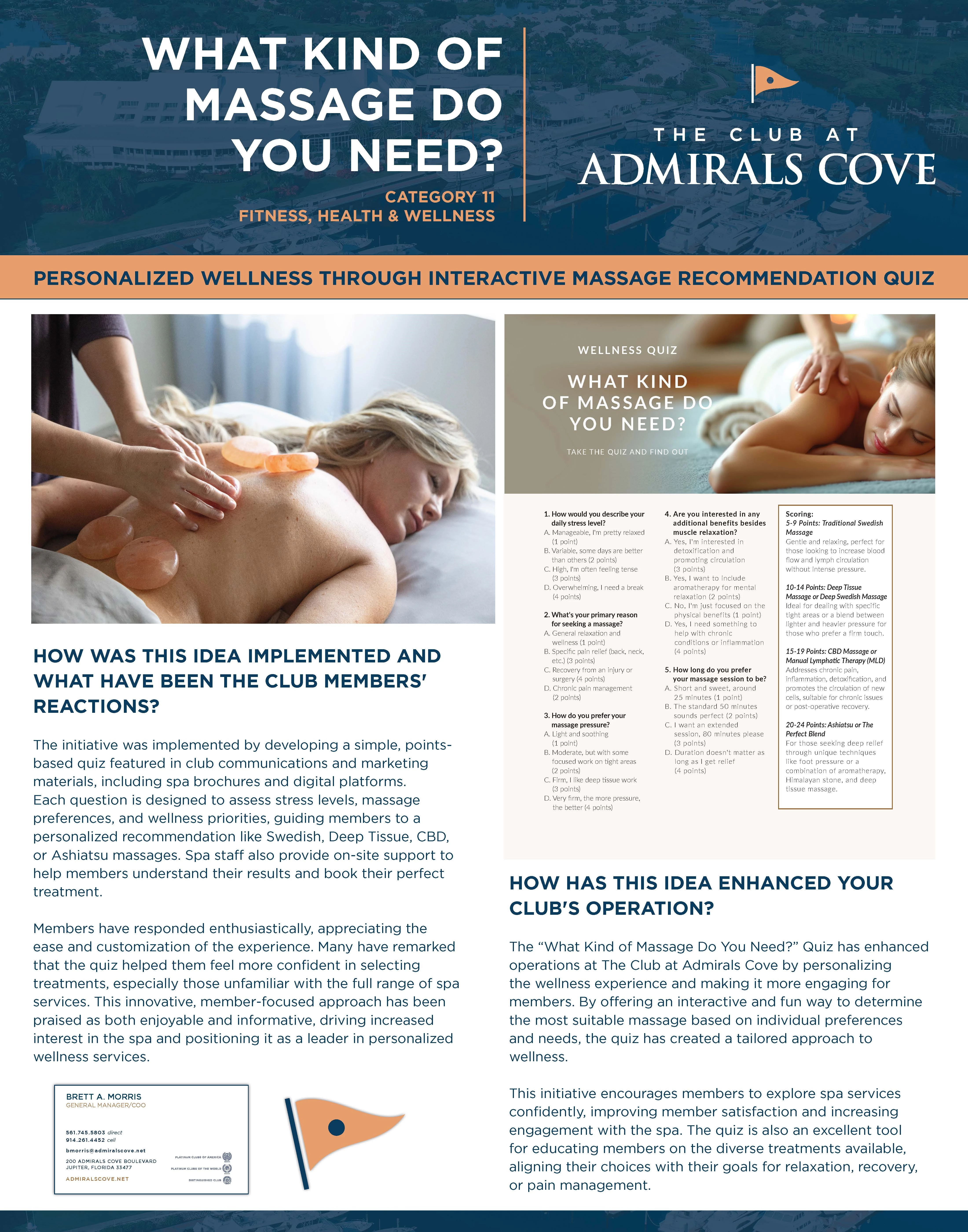 The “What Kind of Massage Do You Need?” Quiz has enhanced operations at The Club at Admirals Cove by personalizing the wellness experience and making it more engaging for members. By offering an interactive and fun way to determine the most suitable massage based on individual preferences and needs, the quiz has created a tailored approach to wellness.
