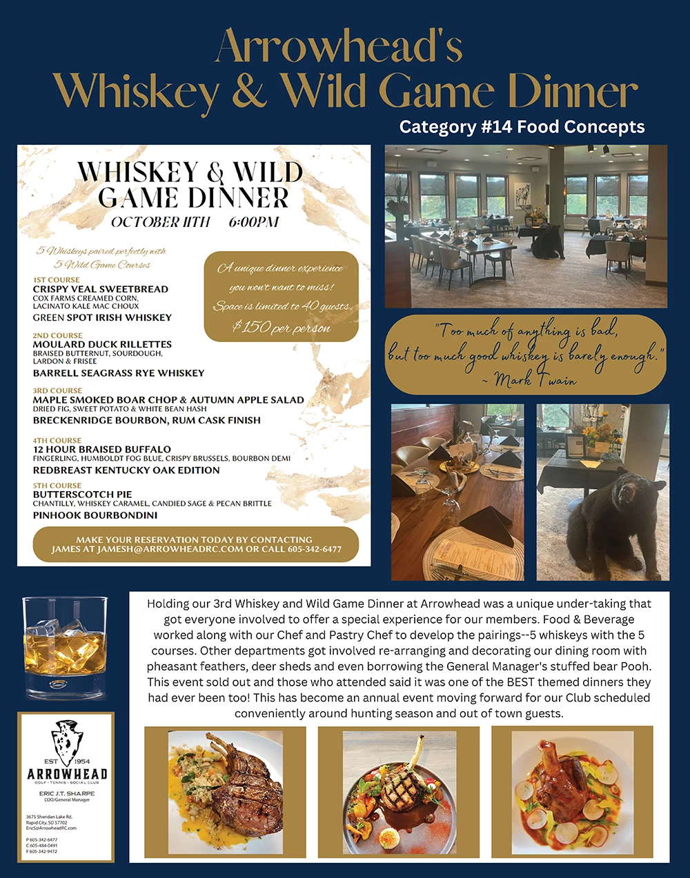Holding our 3rd Whiskey and Wild Game Dinner at Arrowhead was a unique under-taking that got everyone involved to offer a special experience for our members. Food & Beverage worked along with our Chef and Pastry Chef to develop the pairings--5 whiskeys with the 5 courses. This event is now one of the highlights during a slower shoulder season in the fall.