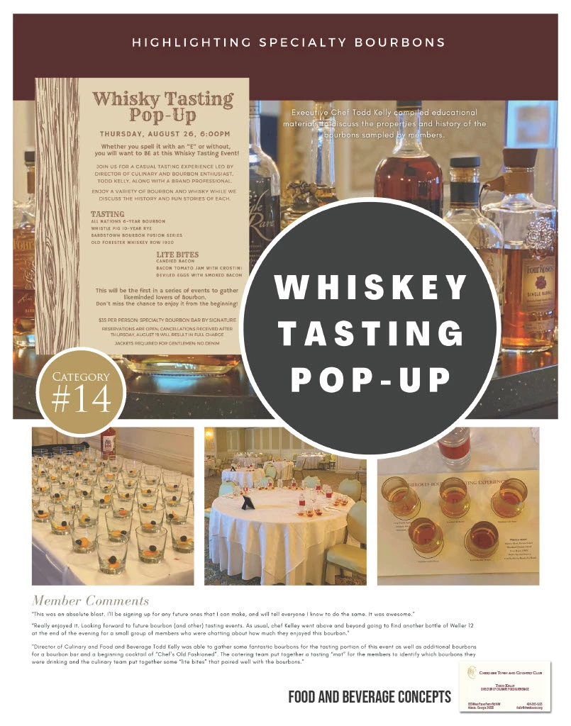 All clubs strive for membership satisfaction Cherokee implemented this “Pop Up” Bourbon Tasting- with short notice to the members it gave the opportunity for members to sign up for this event that normally do not get to attend due to limited availability. In order to please all membership, we have begun to do more “Pop Up” events where we will accommodate as many members as possible and provide different themes.