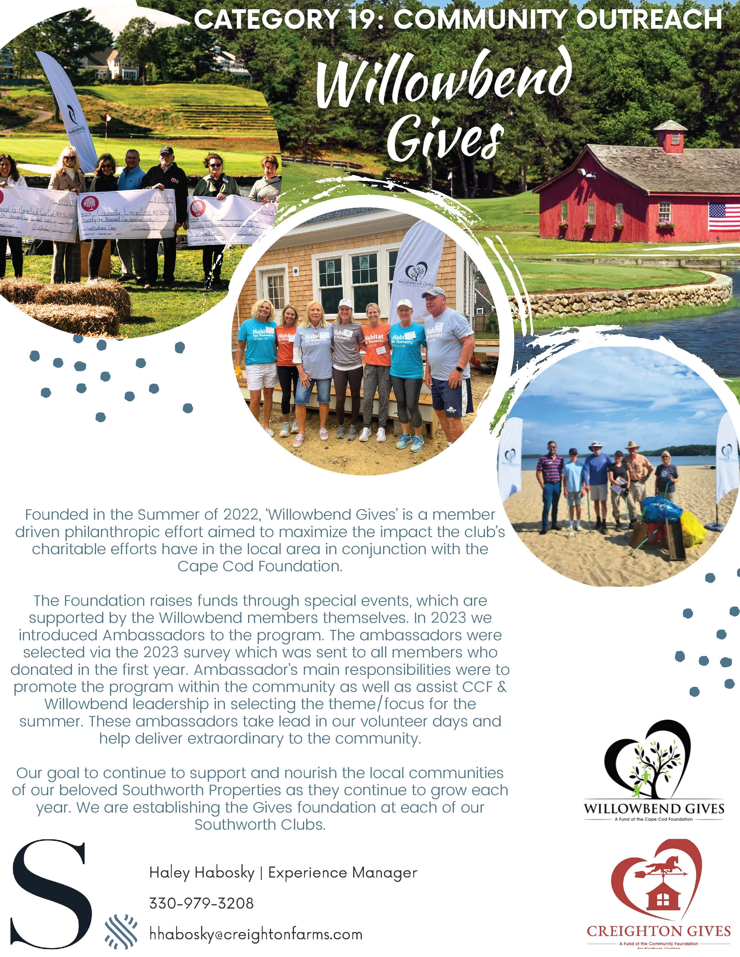 Launching in the Summer of 2022, ‘Willowbend Gives’ is a member driven philanthropic effort aimed to maximize the impact the club’s charitable efforts have in the local area in conjunction with the Cape Cod Foundation. ‘Willowbend Gives’ is an “opt in” fund. We want our members to feel proud of their support, not being pushed hard to give. If members do not choose to opt in they may also participate by purchasing our supporting items. Our first item being a Willowbend Gives retail item that is available in the fitness center and Pro shop in which proceeds will contribute to Willowbend Gives. The second option being our Willowbend Gives specialty cocktail. This is on the menu throughout the summer, available Memorial Day to Labor Day. For each purchase of this specialty drink, a portion will be donated to the Willowbend Gives fund. In addition to opting in and supporting items we host various events throughout the year such as member vs golf pro tournament, dunk tank at 4th of July, Pie Throwing at Fall Fest, and various other events to engage members in giving back to the community.