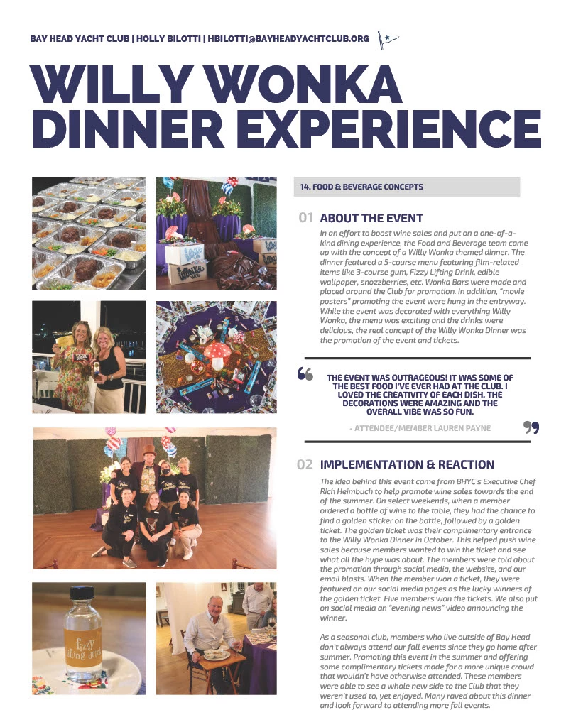 The idea behind this event came from BHYC’s Executive Chef Rich Heimbuch to help promote wine sales towards the end of the summer. On select weekends, when a member ordered a bottle of wine to the table, they had the chance to find a golden sticker on the bottle, followed by a golden ticket. The golden ticket was their complimentary entrance to the Willy Wonka Dinner in October. This helped push wine sales because members wanted to win the ticket and see what all the hype was about. The members were told about the promotion through social media, the website, and our email blasts. When the member won a ticket, they were featured on our social media pages as the lucky winners of the golden ticket. Five members won the tickets. We also put on social media an “evening news” video announcing the winner.