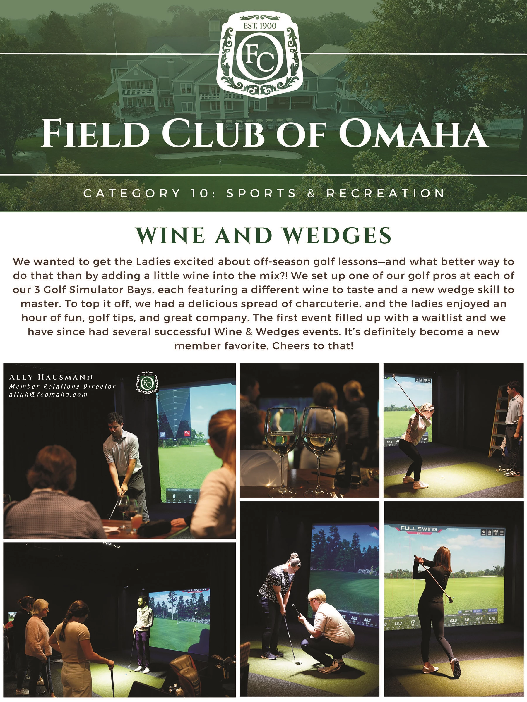 We wanted to provide a way for our ladies to get together and enjoy some off-season golf instruction in our brand new Golf Simulator Bays. We had 3 of our Golf Pros and each of them worked on a different skill in each of their bays. We divided the ladies up and they spent 20 minutes at each bay, and then switched. the Ladies were served 3 different wine tasters so they had a different one for each bay. We also setup a grazing charcuterie board for them to enjoy. The ladies LOVED it and it has become a favorite event. It has also generated lesson revenue for our Golf Pros during the offseason! Not only did our seasoned players participate, this event has also generated participation from ladies who are new to the game!