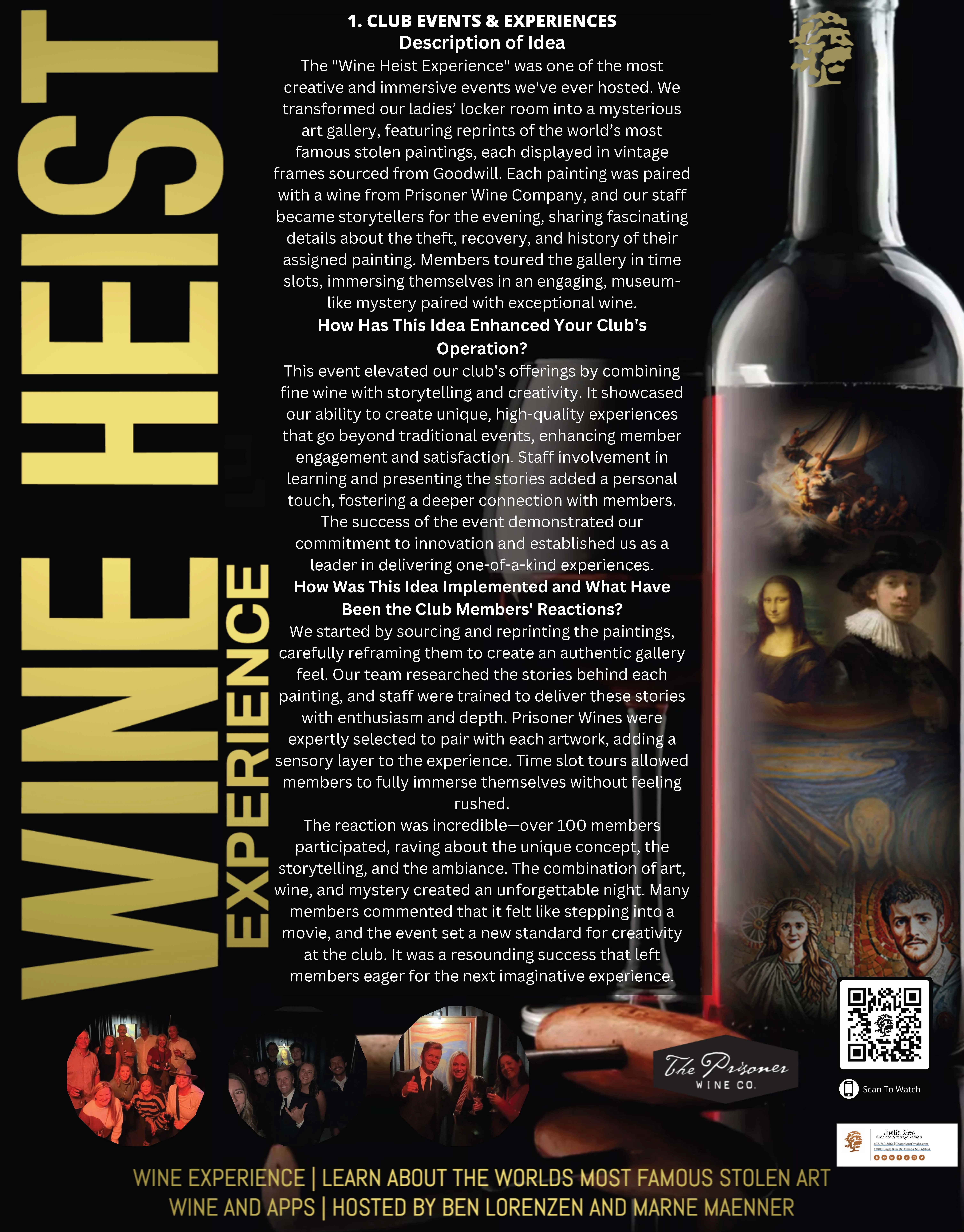 The "Wine Heist Experience" was one of the most creative and immersive events we've ever hosted. We transformed our ladies’ locker room into a mysterious art gallery, featuring reprints of the world’s most famous stolen paintings, each displayed in vintage frames sourced from Goodwill. Each painting was paired with a wine from Prisoner Wine Company, and our staff became storytellers for the evening, sharing fascinating details about the theft, recovery, and history of their assigned painting. Members toured the gallery in time slots, immersing themselves in an engaging, museum-like mystery paired with exceptional wine.