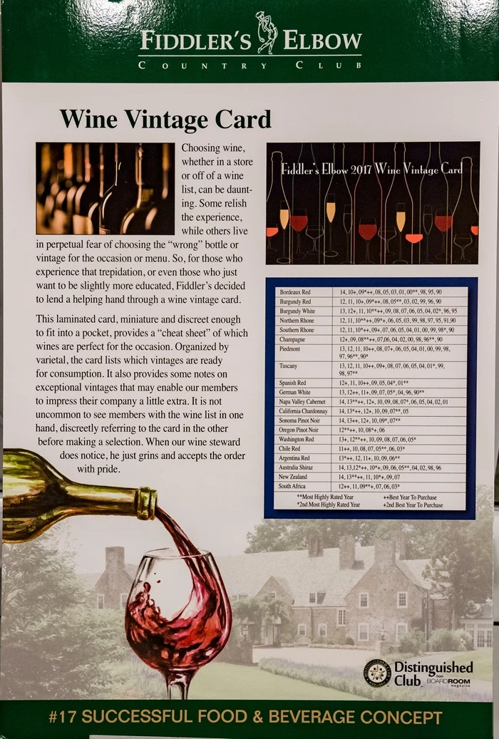 This laminated card, miniature and discreet enough to fit into a pocket, provides a “cheat sheet” of which wines are perfect for the occasion. Organized by varietal, the card lists which vintages are ready for consumption. It also provides some notes on exceptional vintages that may enable our members to impress their company a little extra. It is not uncommon to see members with the wine list in one hand, discreetly referring to the card in the other before making a selection. When our wine steward does notice, he just grins and accepts the order with pride.