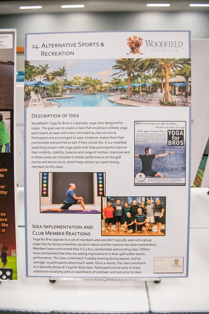 Woodfield’s Yoga for Bros is a specialty yoga class designed for males. The goal was to create a class that would put unlikely yoga participants at ease with a less intimidating class structure. Participants are encouraged to wear whatever makes them feel comfortable and are free to talk if they would like. It is a modified stretching session with yoga poses that help participants improve their mobility, stability, balance and range of motion. Improvement in these areas can translate to better performance on the golf course and tennis court, which helps attract our sport-loving members to this class.