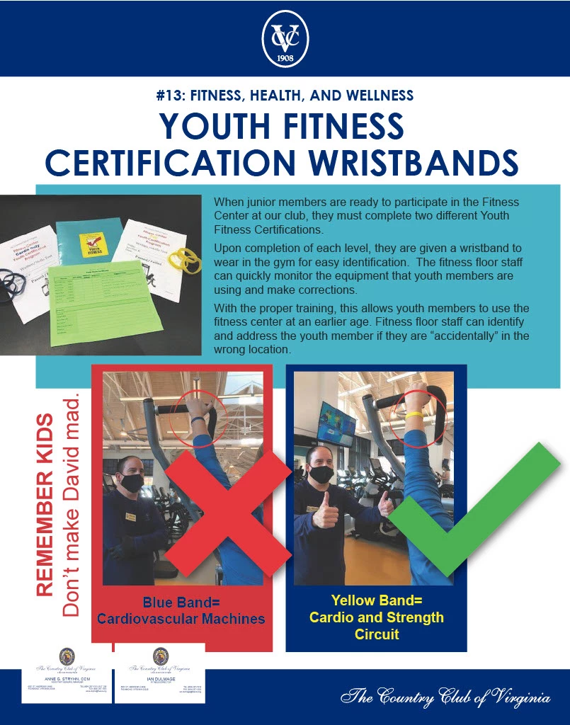 We purchased 25 yellow and blue colored silicone wrist bands, which are stored at the Fitness check-in desk. As youth members check in, staff hand them the correct color band, depending on the appropriate certification. Youth members wear the band during their workout and return it to the desk when they are done.