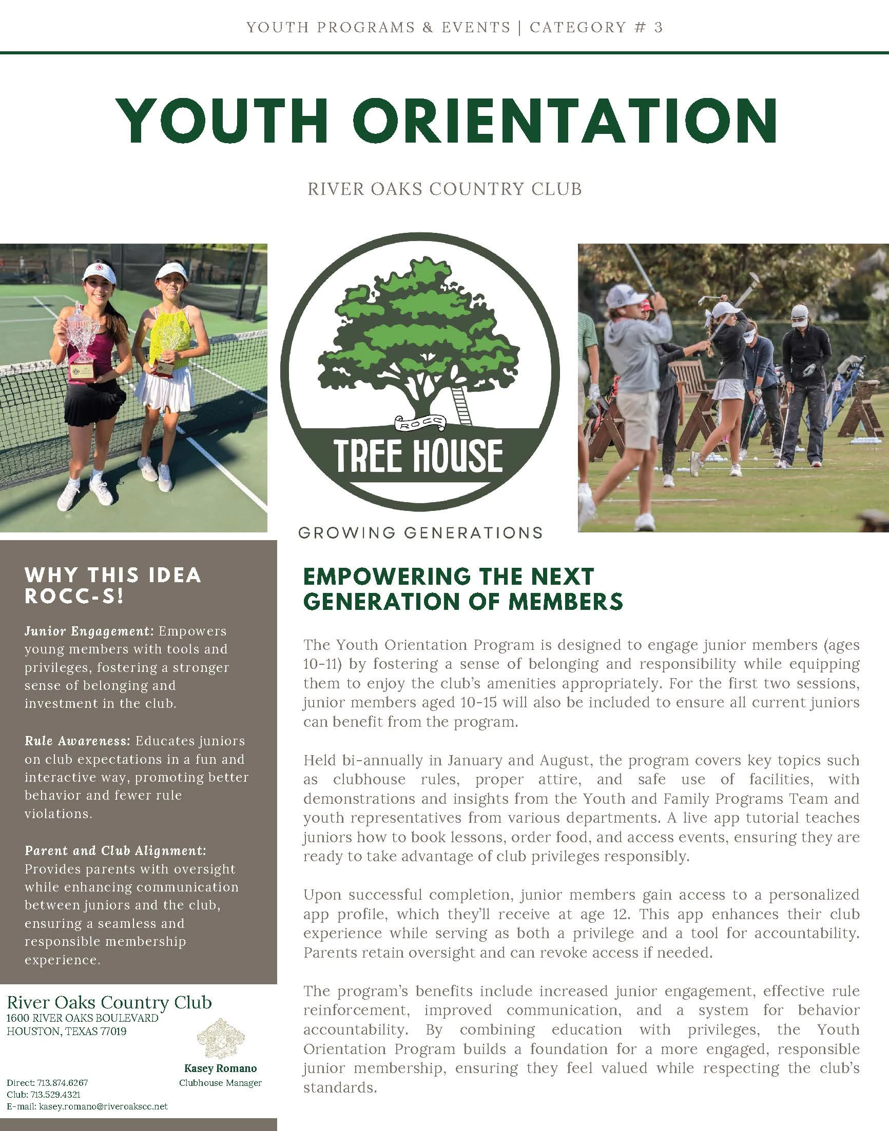 Our our youth operations have continued to grow since the Pandemic, and many of our children reaching their teens, we recognized that we needed to both educate our "junior" members, as well as foster their buy in at the Club. Holding the Youth Orientation allows us to establish relationships with our teen members, clearly outline Club standards and give them an opportunity to utilize the Club at their discretion. The program’s benefits include increased junior engagement, effective rule reinforcement, improved communication, and a system for behavior accountability. By combining education with privileges, the Youth Orientation Program builds a foundation for a more engaged, responsible junior membership, ensuring they feel valued while respecting the club’s standards.