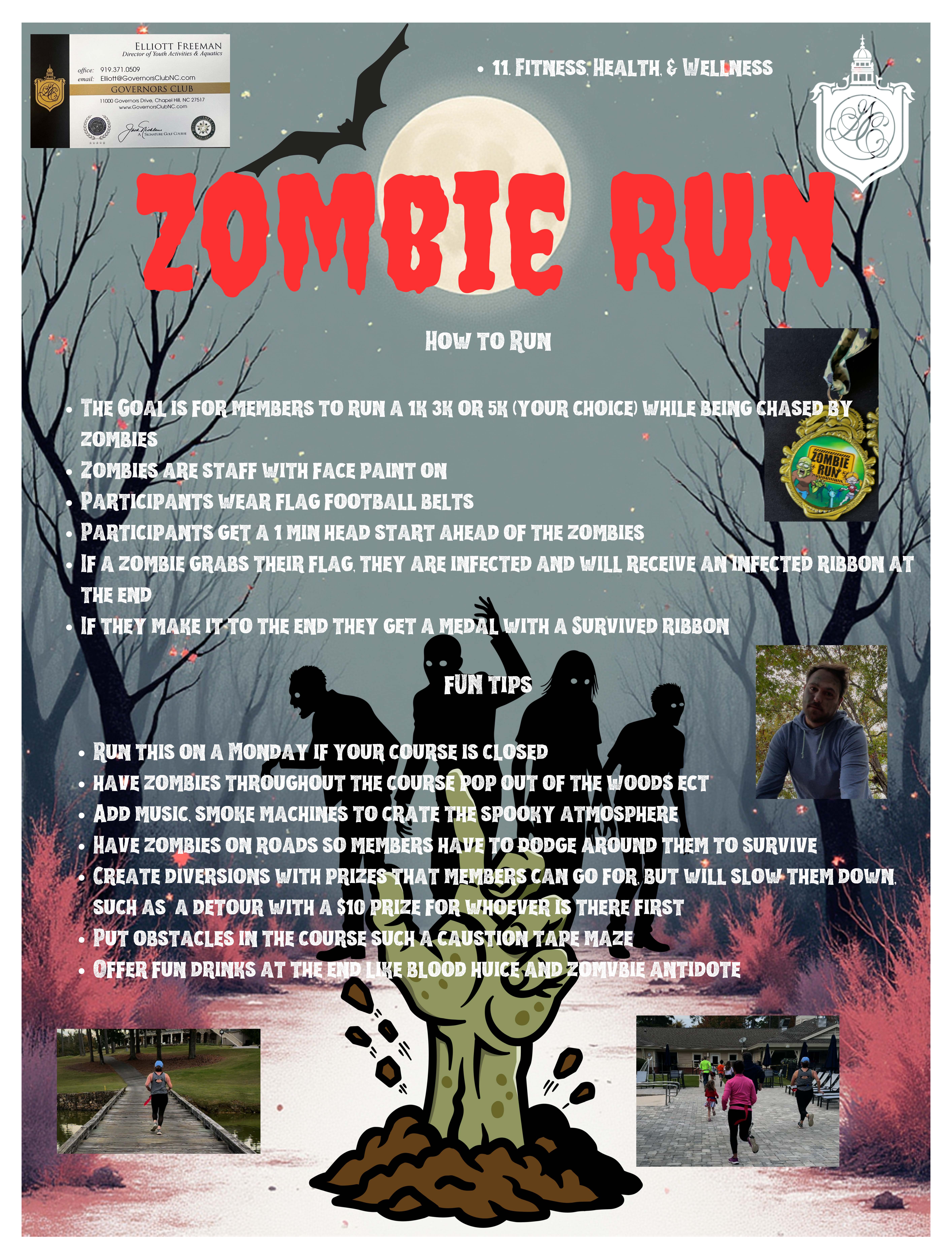 The Zombie Run offers participants an exciting rush of adrenaline while fully embracing the Halloween spirit. This fast-paced 3K run begins with a head start, giving runners the chance to escape our staff dressed as zombies. Along the course, participants must navigate hidden obstacles while avoiding surprise zombie encounters. Those who are tagged are considered “infected,” but are still encouraged to complete the race and will receive a commemorative medal at the finish. The question remains—will you survive, or will you be infected?