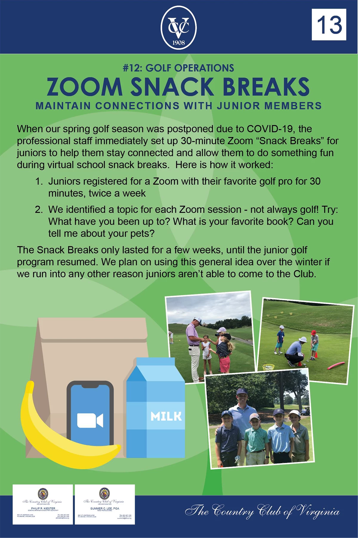 When our spring golf season was postponed due to COVID-19, the professional staff immediately set up 30- minute Zoom “Snack Breaks” for juniors to help them stay connected and allow them to do something fun during virtual school snack breaks.