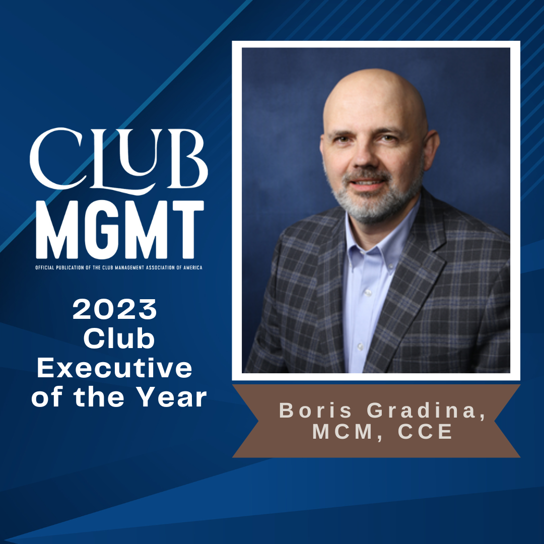 Congratulations to Boris Gradina, MCM, CCE, named the Club Management magazine 2023 Club Executive of the Year. A 17-year CMAA member, Gradina currently serves as the General Manager/Chief Executive Officer of Bel Air, MD.