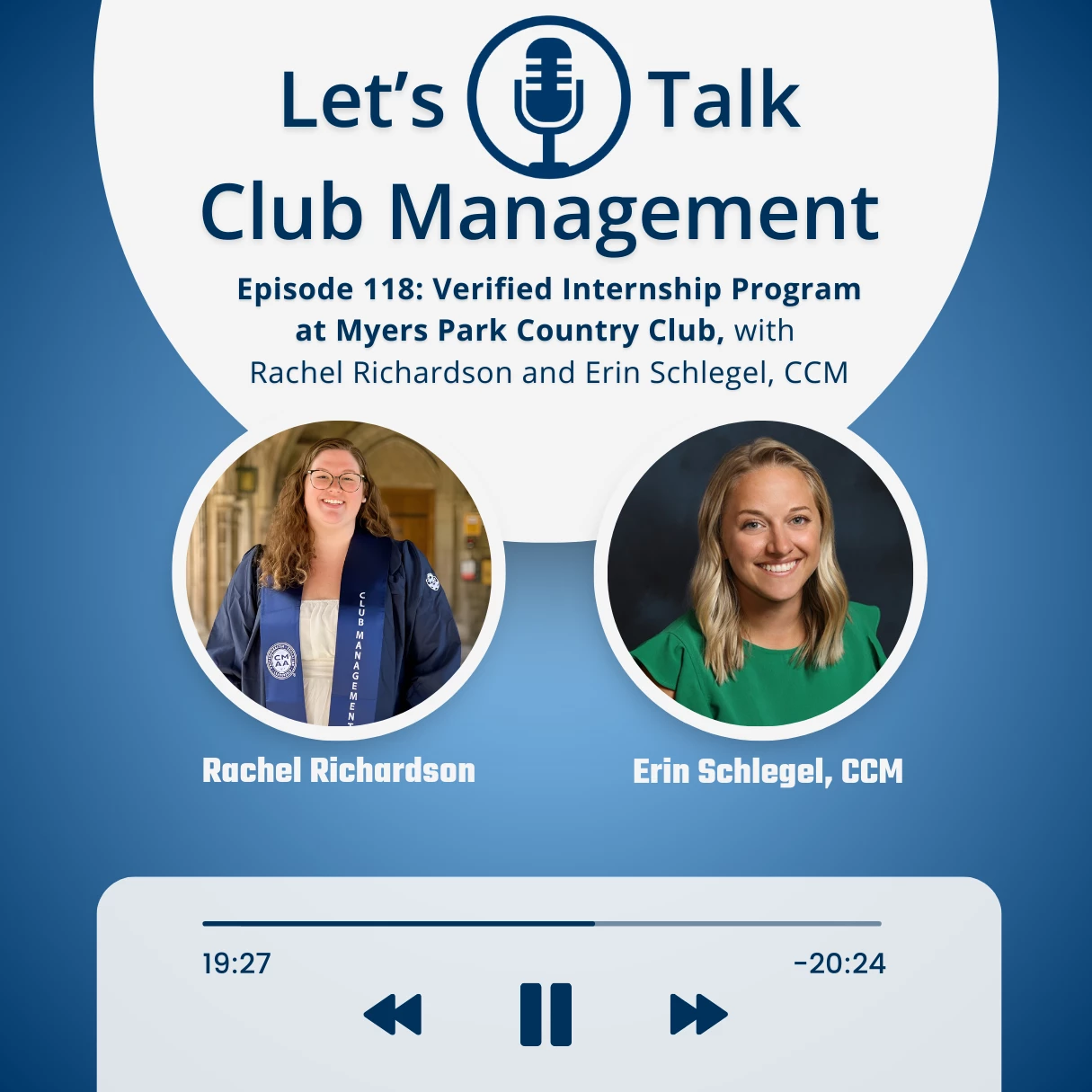 In this episode, we had the opportunity to chat with Erin Schlegel, CCM, the Youth and Activities Director at Myers Park Country Club, and Rachel Richardson, one of Myers Park’s summer interns. Erin and Rachel joined us to talk about the internship experience at Myers Park as well as how that has been adjusted and tweaked to conform to CMAA’s Verified Internship Program criteria. Erin shares some of her best practices for developing and running an internship program and Rachel dives in to all of the things she has learned and experienced over the summer so far.