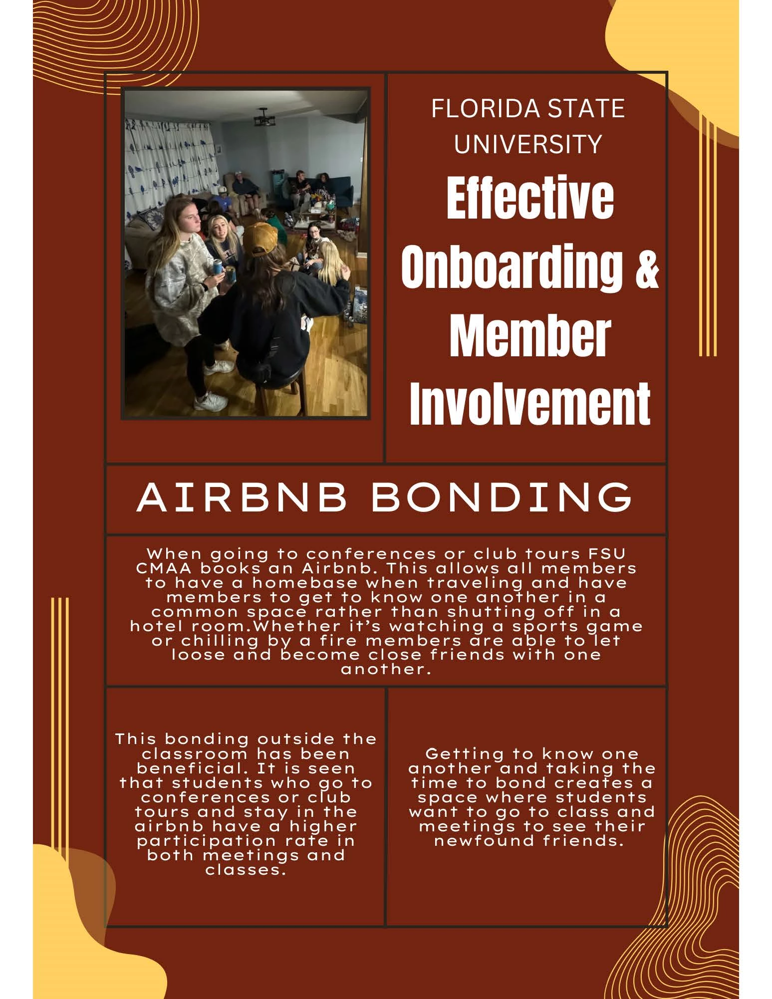 When going to conferences or club tours FSU CMAA books an Airbnb. This allows members to get to know each other better by using a shared space.